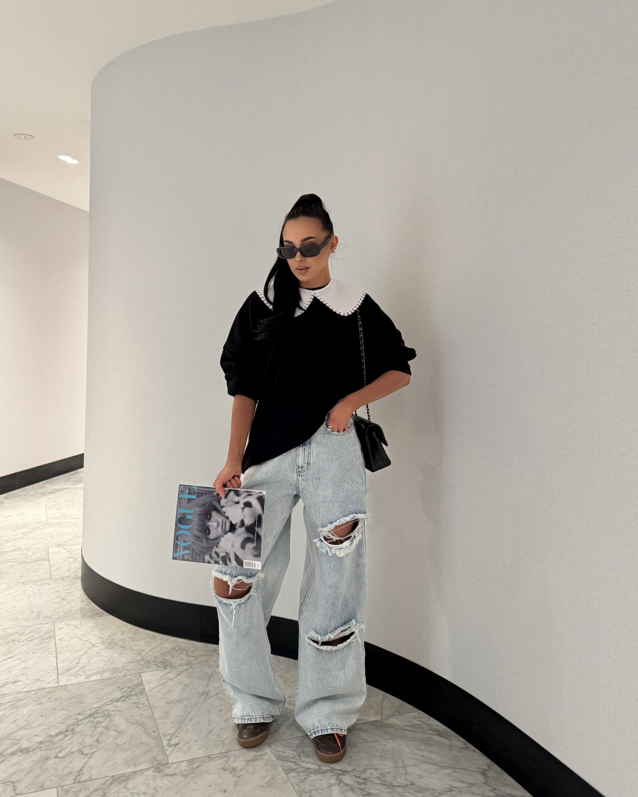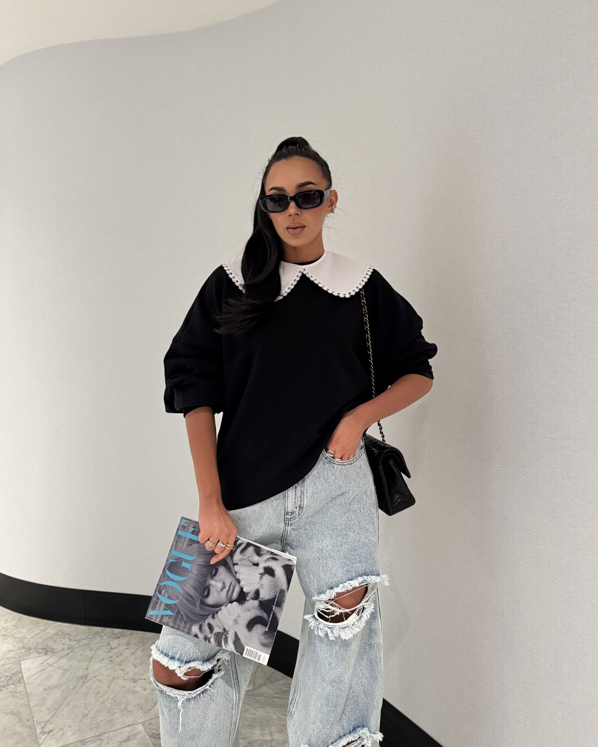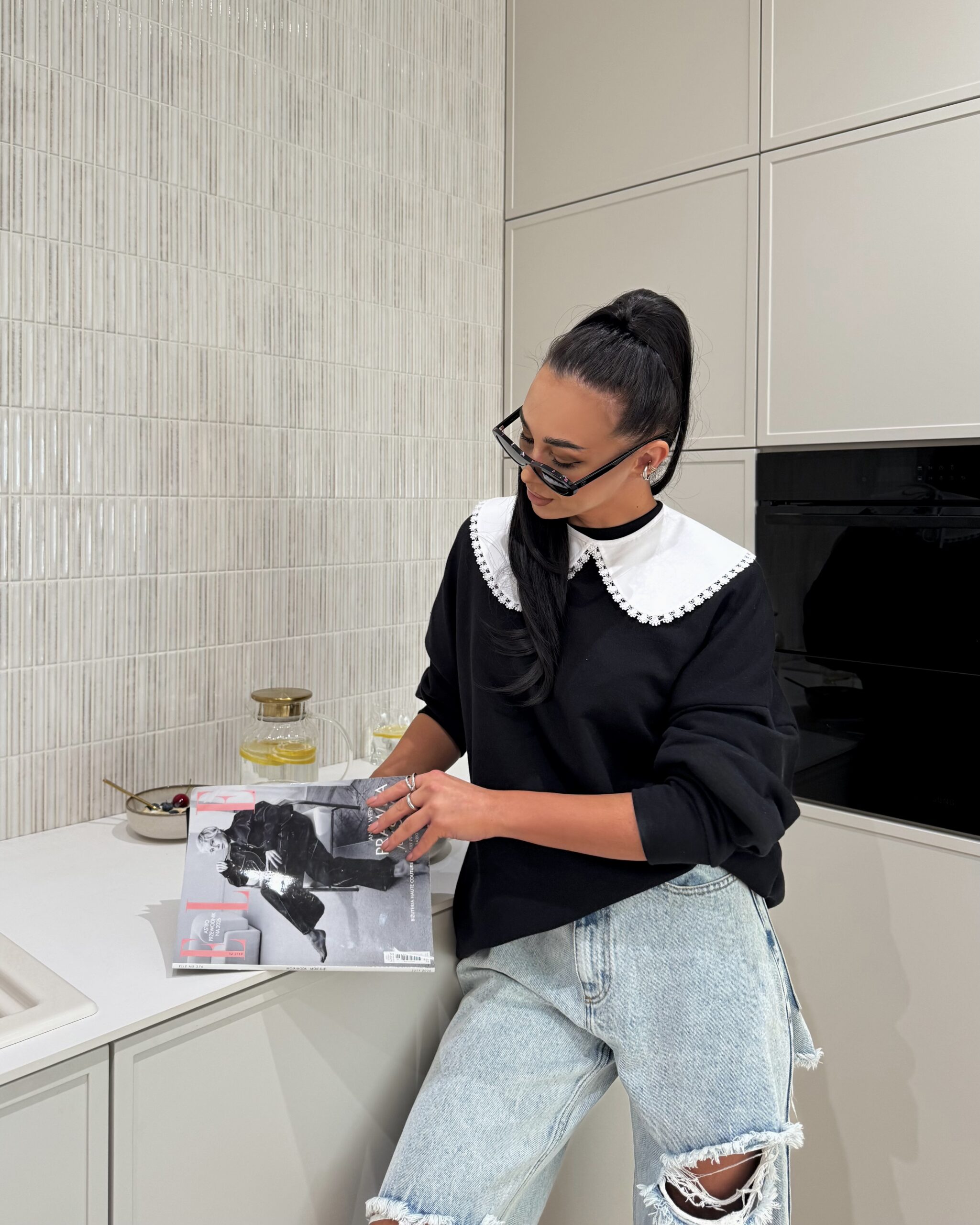 Stylowa czarna bluza La Milla z białym kołnierzykiem to połączenie elegancji i komfortu w nowoczesnym wydaniu. Modny kontrastowy kołnierzyk z ozdobnym wykończeniem nadaje bluzie wyjątkowego charakteru, tworząc efekt stylu „college” z nutą kobiecego szyku. Wykonana z miękkiej, przyjemnej w dotyku dzianiny, zapewnia wygodę przez cały dzień. Doskonała do jeansów, spódnic czy eleganckich spodni – idealna na co dzień, do pracy lub spotkania ze znajomymi.