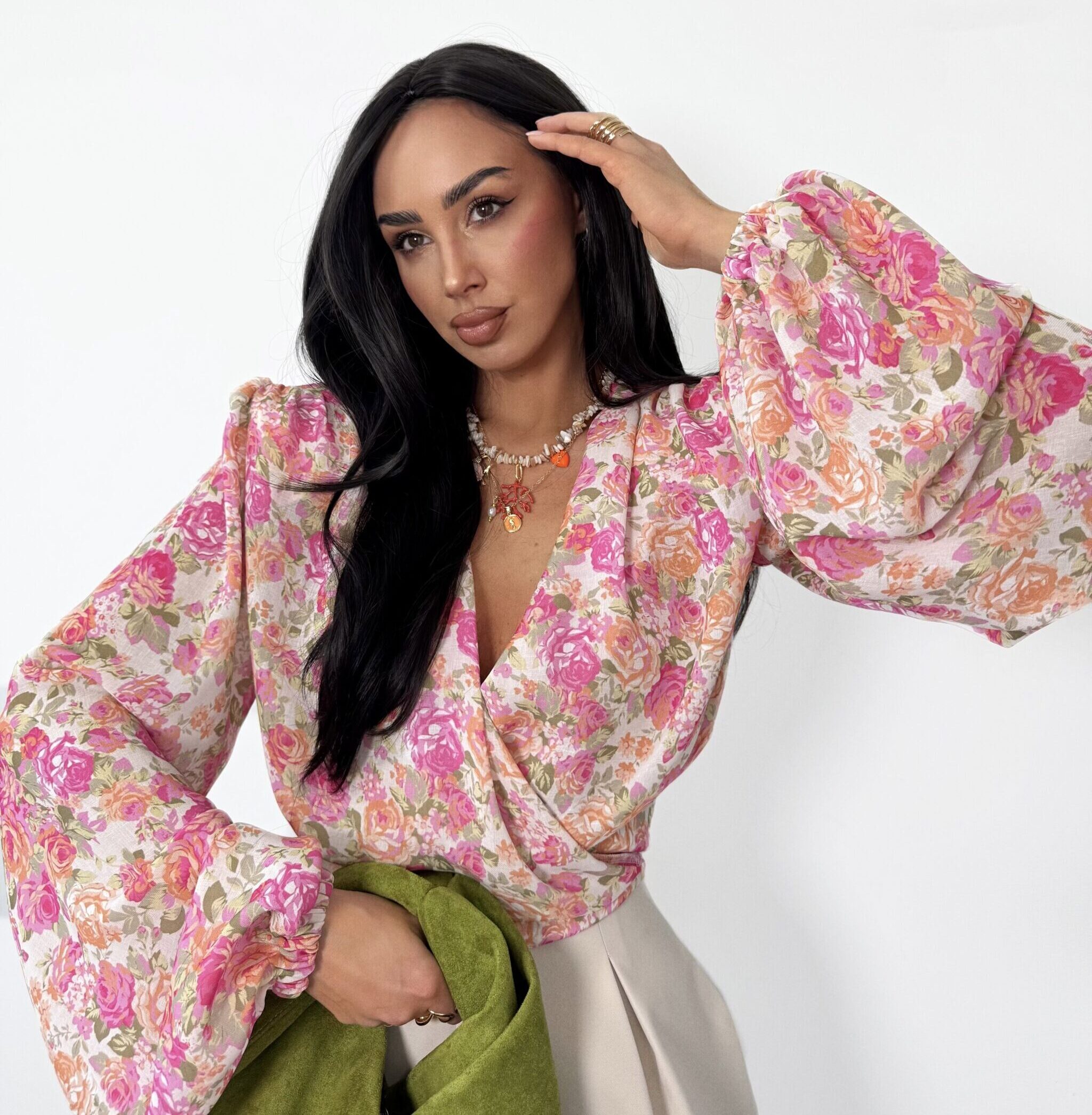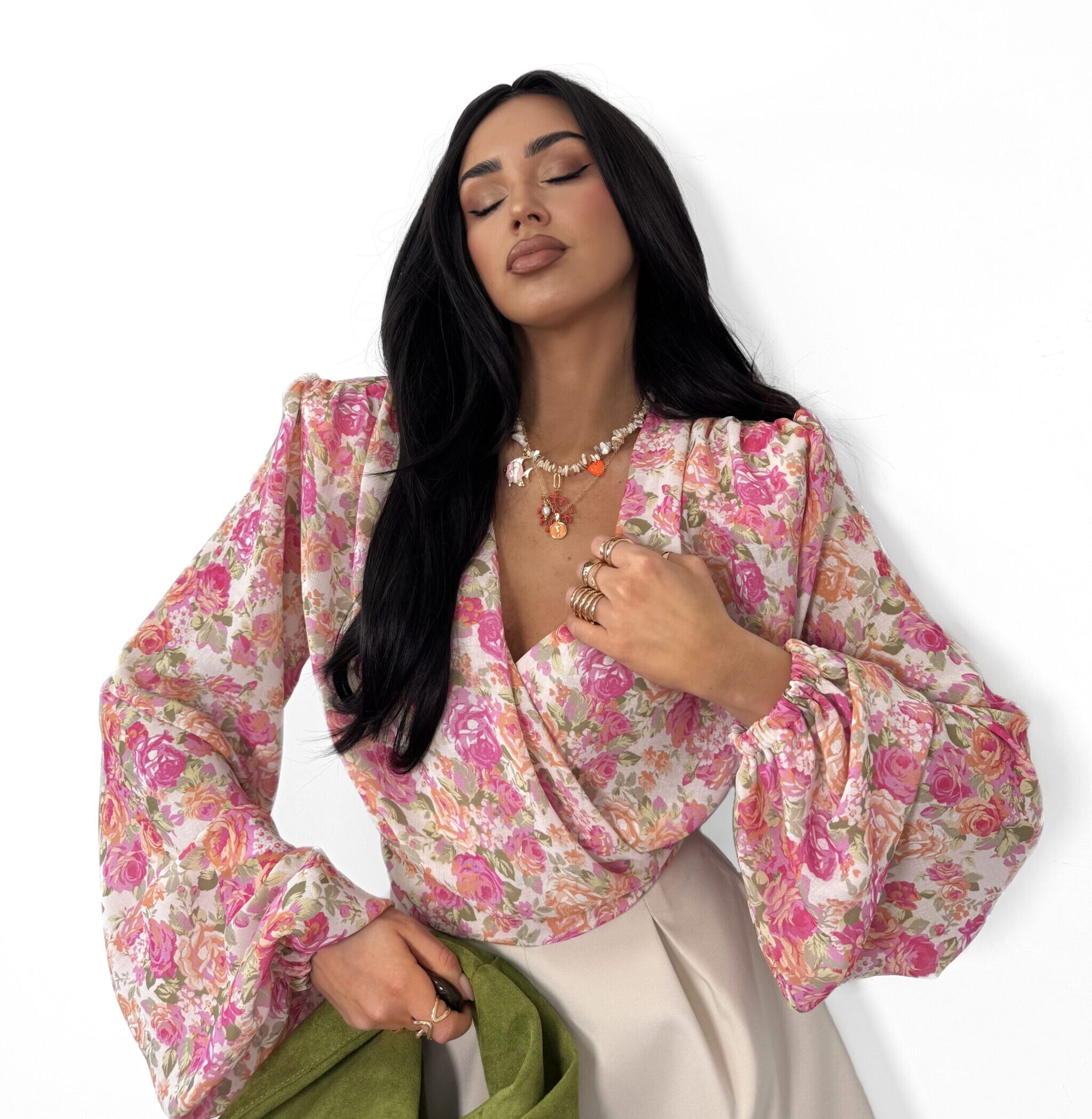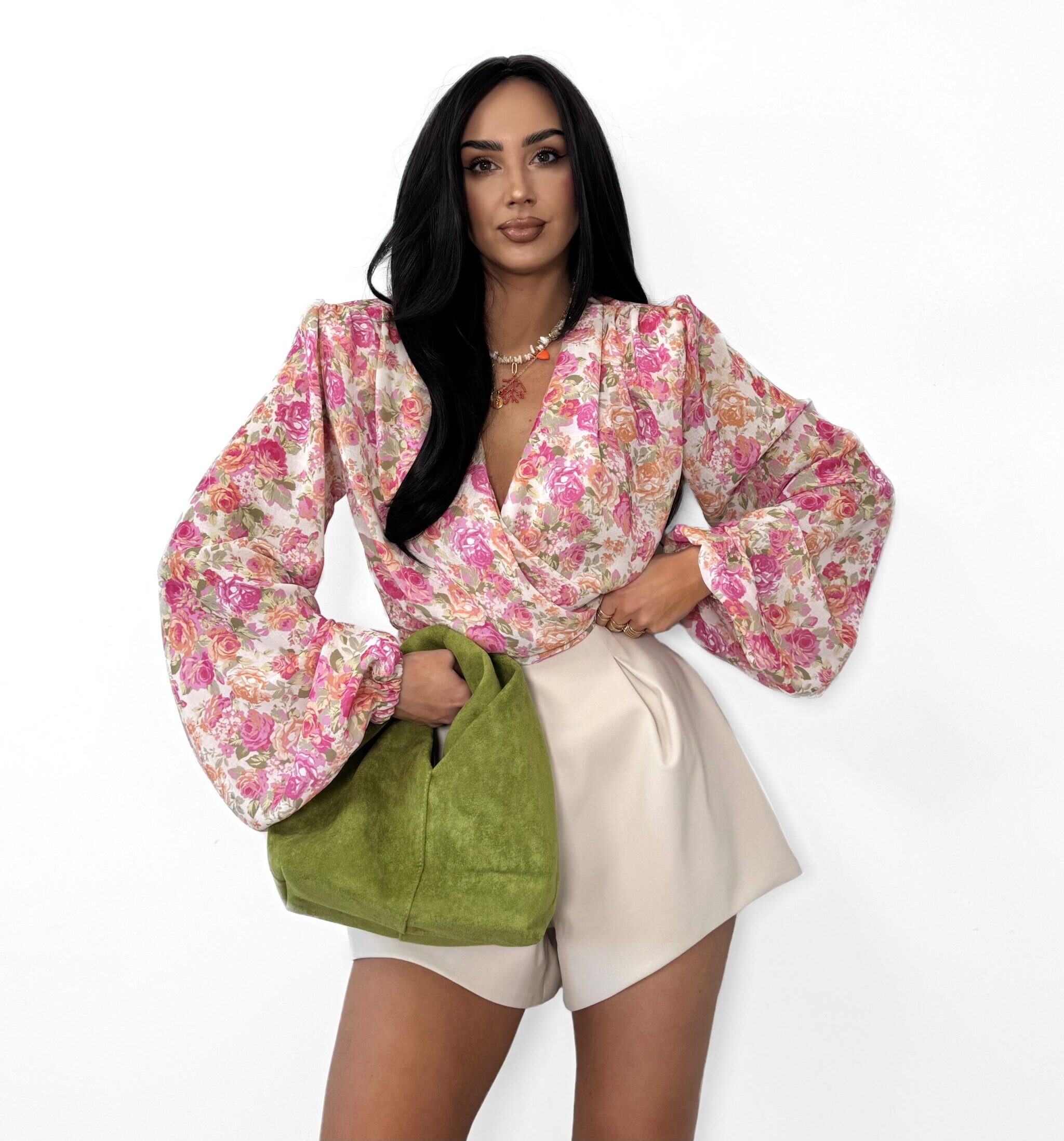 Napisz pierwszą opinię o „Bluzka kopertowa La Milla beżowo-pudrowa w kwiatki”