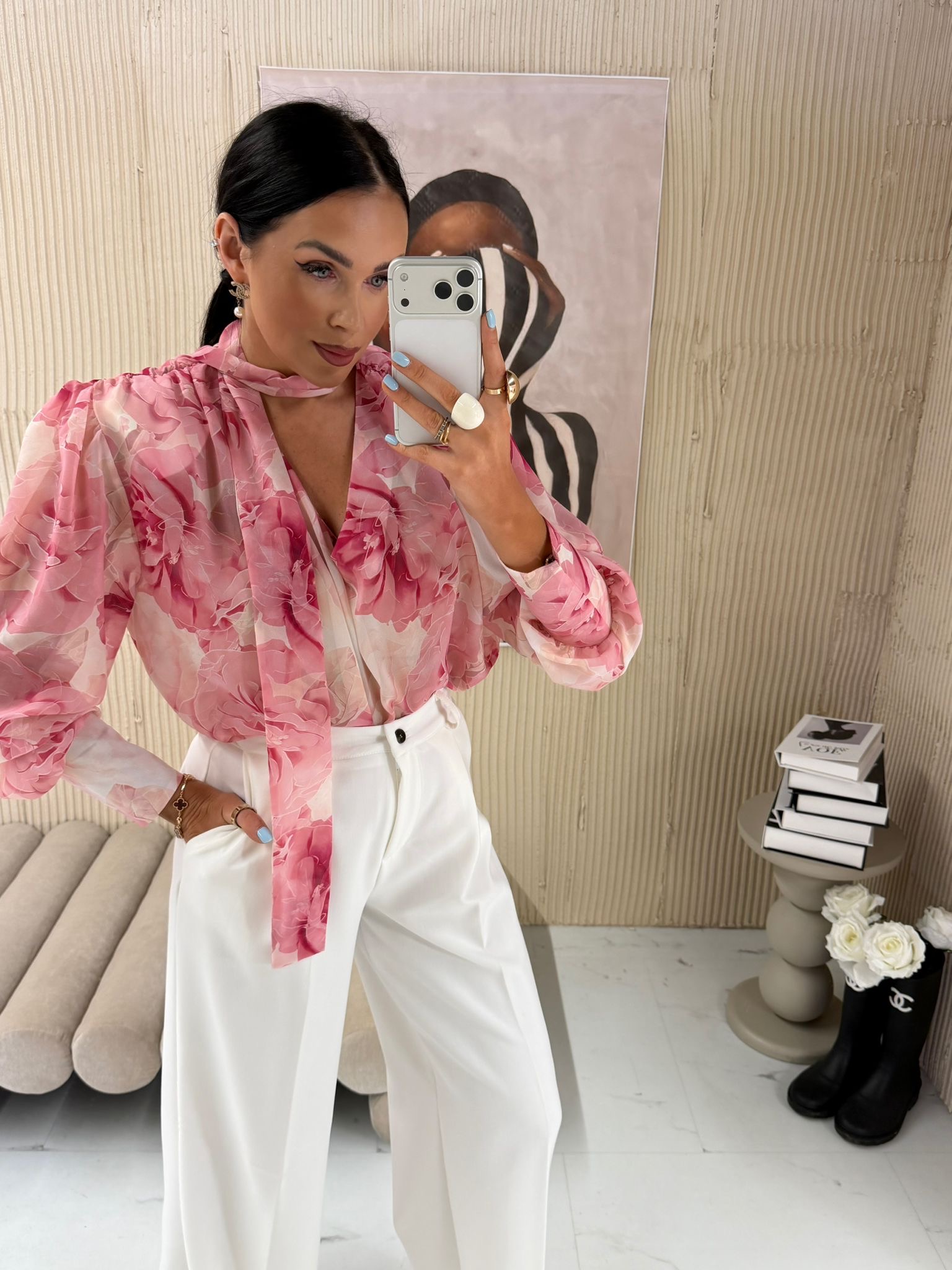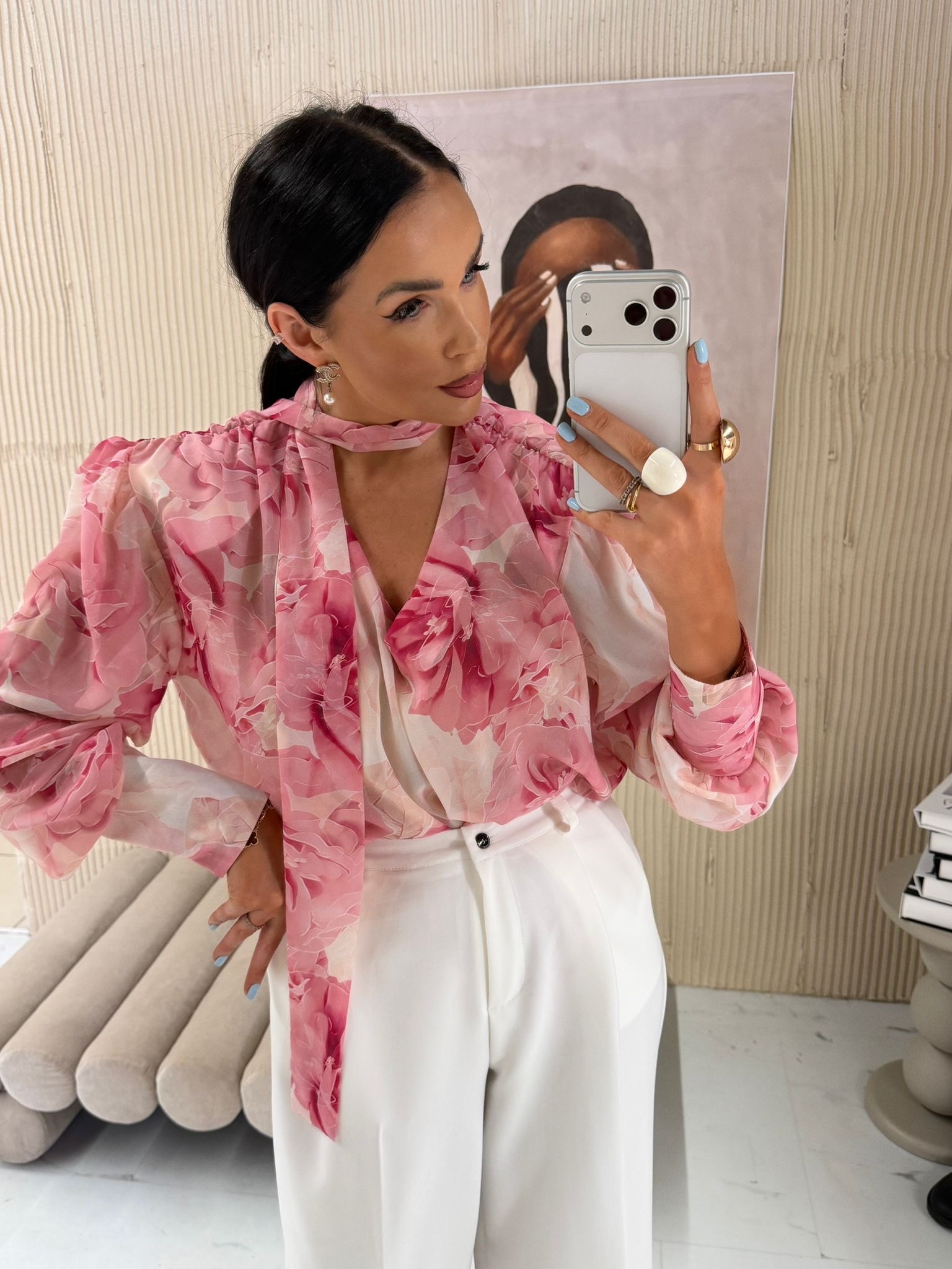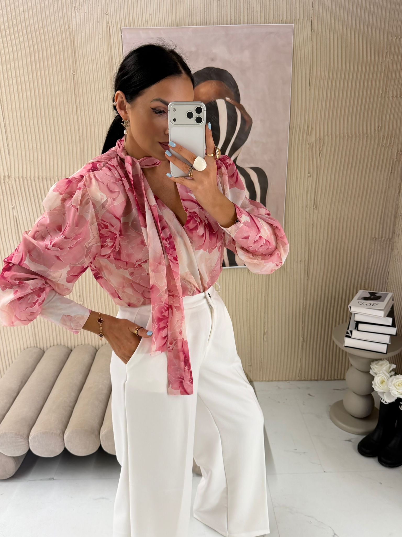 Bluzka została wykonana z wysokiej jakości materiału, który zapewnia komfort noszenia przez cały dzień. Lekko oversize’owy krój pięknie układa się na sylwetce, podkreślając jej atuty i gwarantując swobodę ruchów. Subtelna kolorystyka różowo-śmietankowa dodaje stylizacji świeżości i romantycznego charakteru.