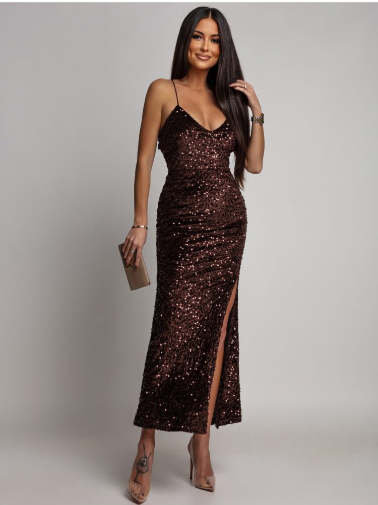 Olśniewająca czekoladowa sukienka maxi, stworzona na wyjątkowe okazje. Całość pokryta drobnymi, połyskującymi cekinami pięknie odbija światło przy każdym ruchu, tworząc spektakularny efekt. Jej największym atutem są zmysłowo odkryte plecy z cienkimi, krzyżującymi się ramiączkami, które nadają stylizacji wyrafinowanej lekkości.