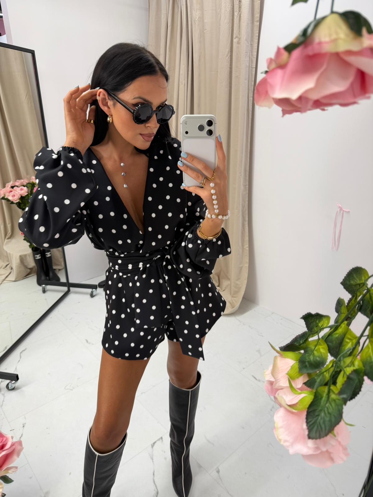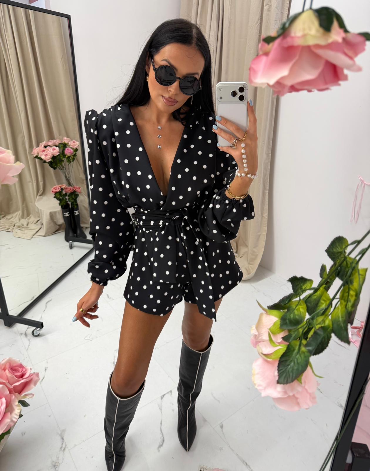 Długie rękawy z lekkim bufiastym wykończeniem oraz wiązanie w talii tworzą harmonijny i szykowny fason. Krótka, dopasowana nogawka wydłuża optycznie nogi, dzięki czemu stylizacja prezentuje się niezwykle efektownie.