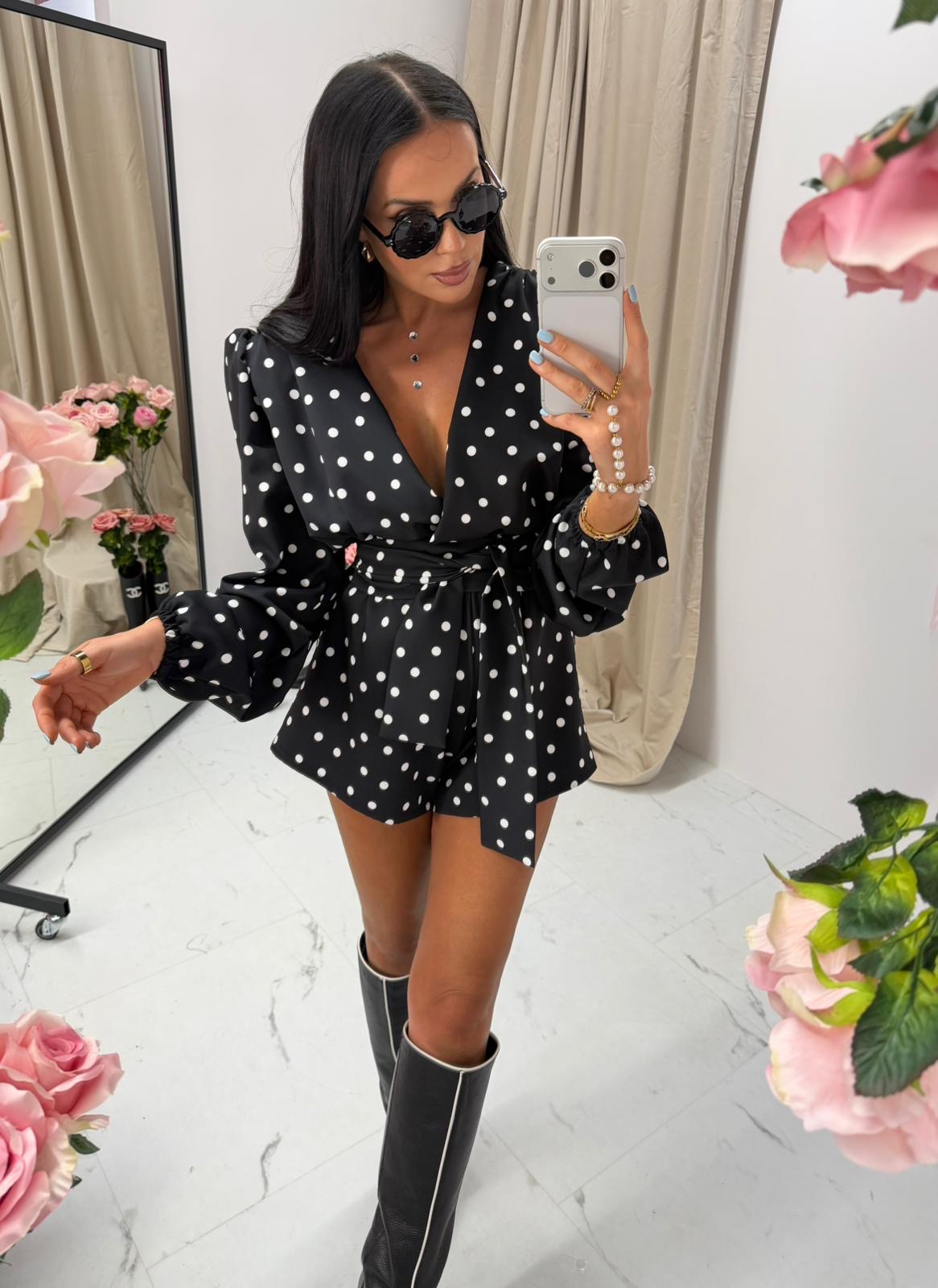 Stylowy i kobiecy kombinezon La Milla w klasyczny wzór białych groszków to idealna propozycja na wyjątkowe okazje i modne wyjścia. Wykonany z gładkiego, elegancko układającego się materiału, świetnie podkreśla figurę, a kopertowy dekolt dodaje mu subtelnej zmysłowości.