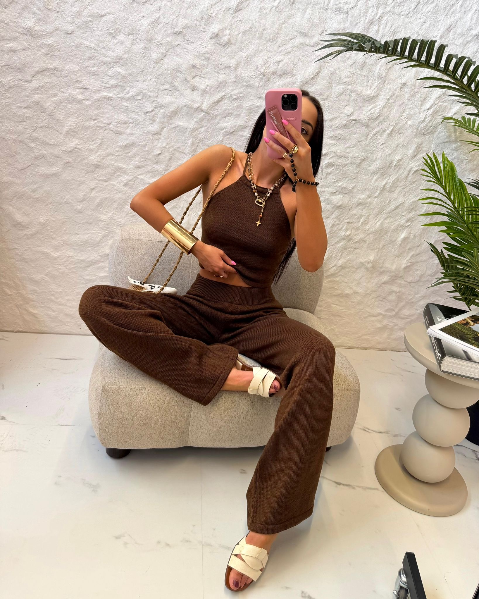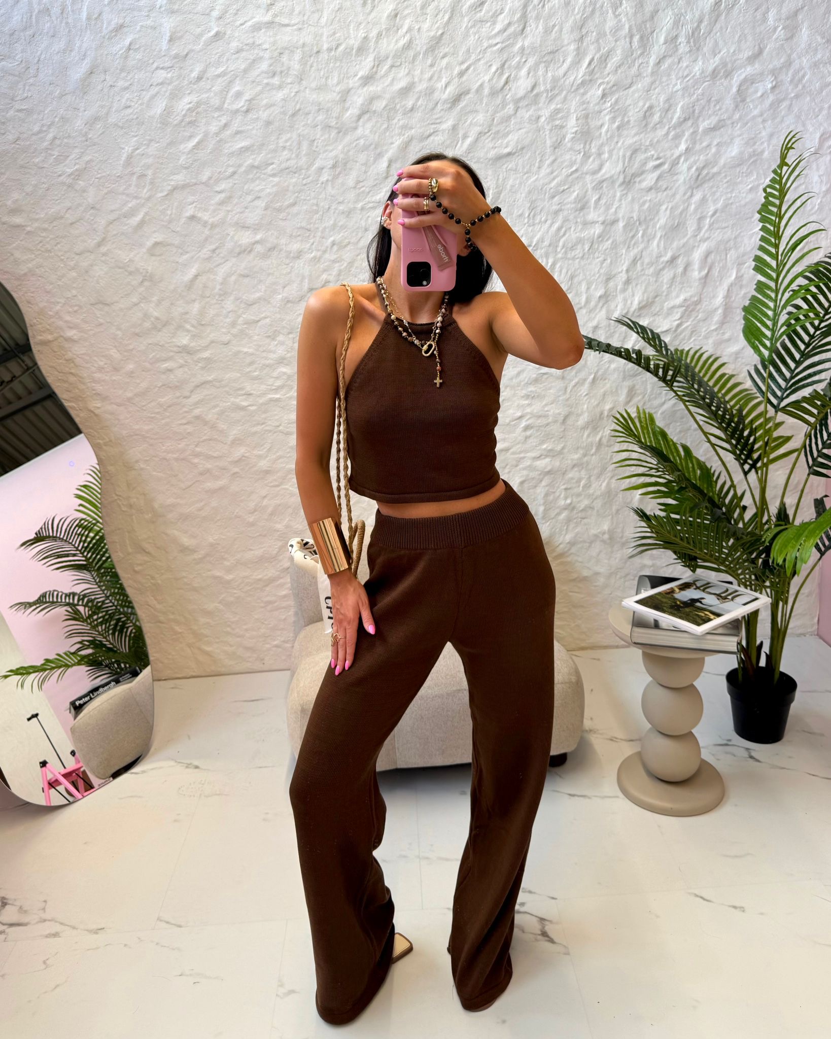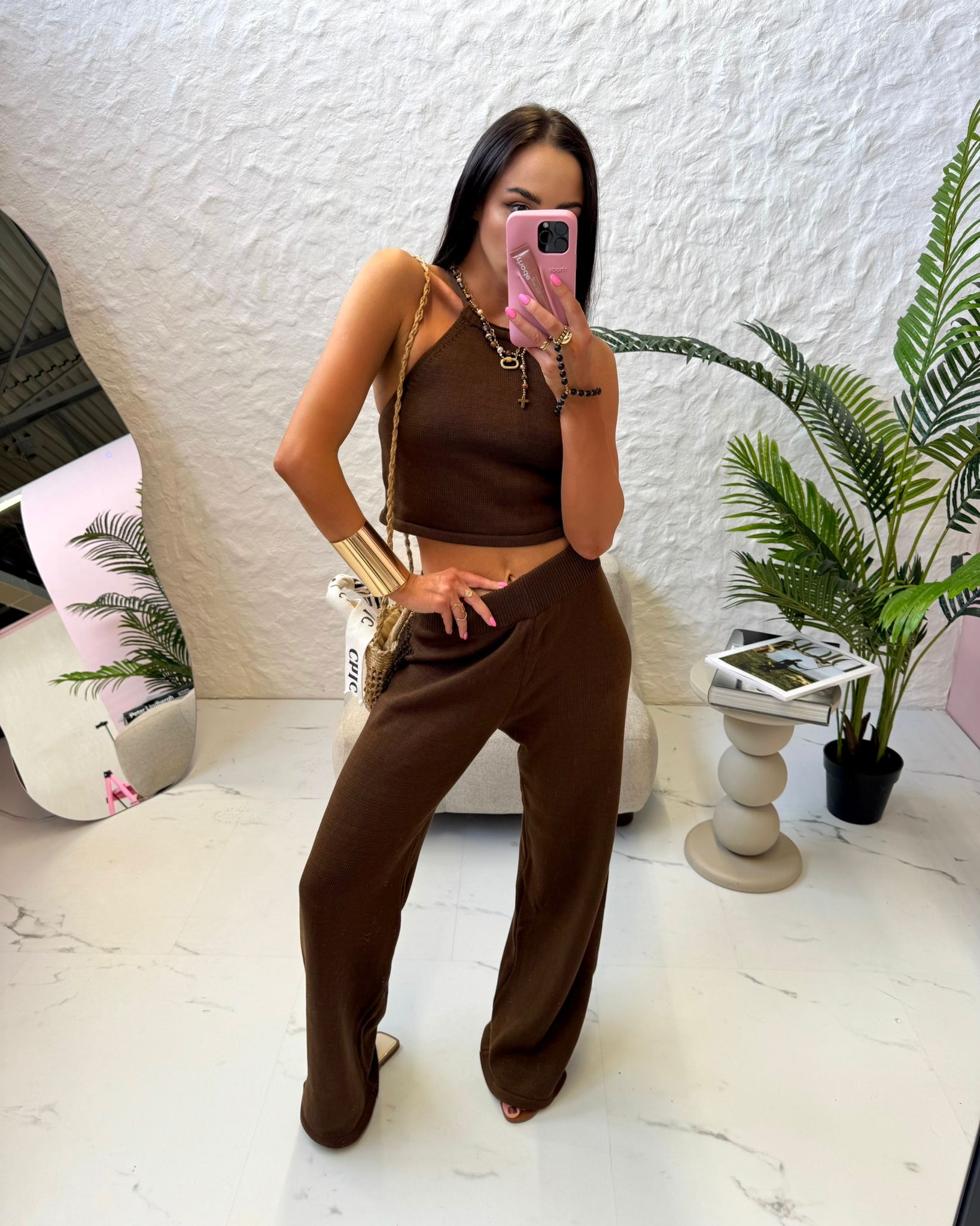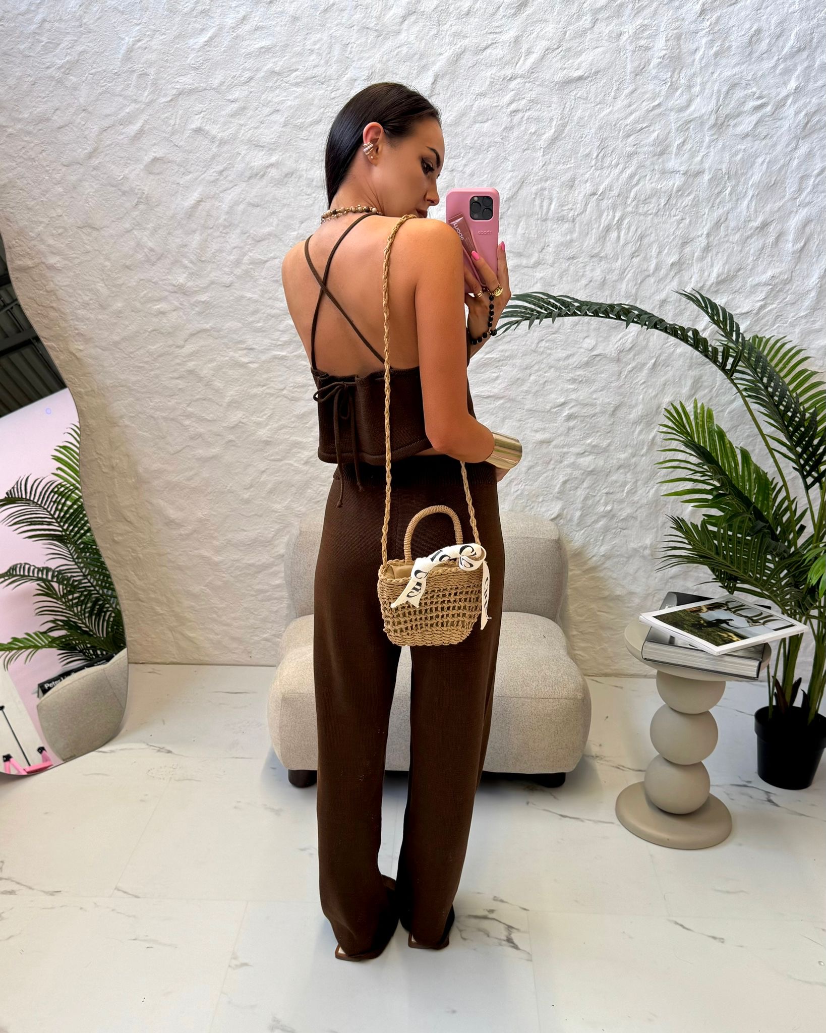 Stylowy komplet z dzianiny w odcieniu głębokiego brązu. Top z cienkimi ramiączkami i efektownym wiązaniem na plecach doskonale podkreśla sylwetkę, a luźne spodnie z elastyczną talią zapewniają wygodę i swobodę ruchów. Idealny wybór na co dzień, podróże i letnie spacery.