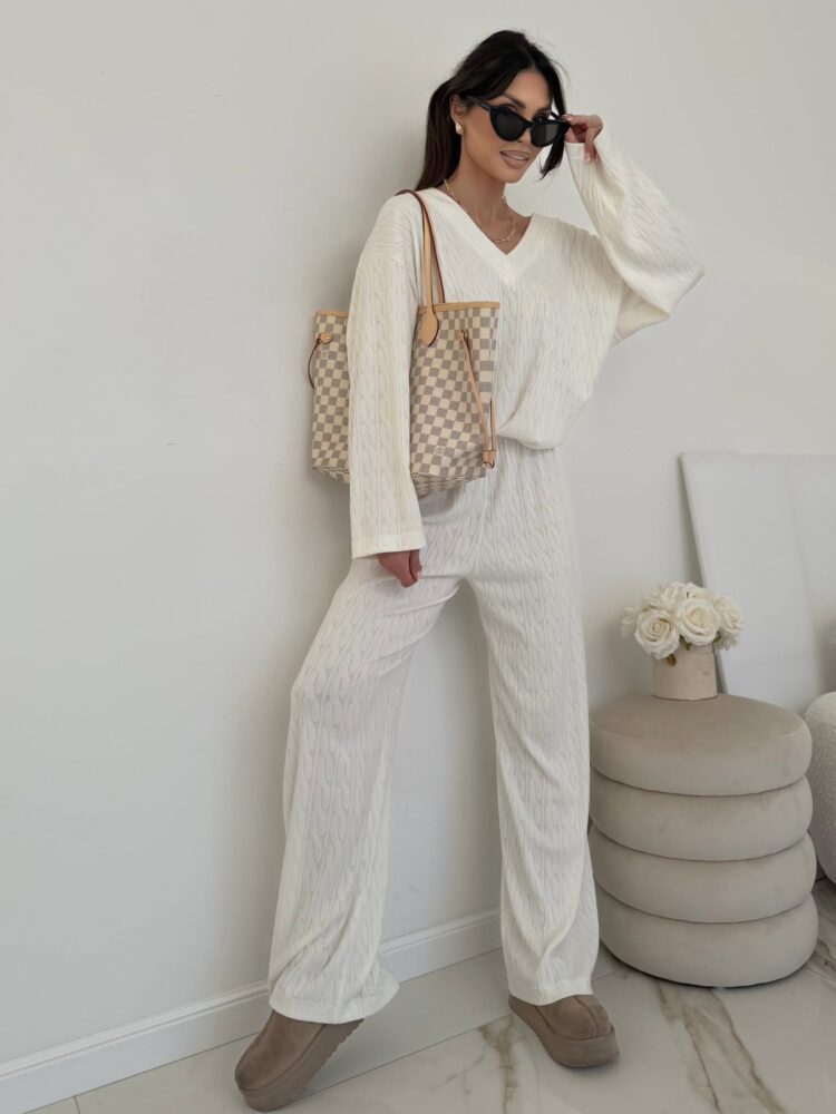 Elegancki komplet dzianinowy składający się z luźnej bluzki z dekoltem w serek oraz spodni o swobodnym kroju. Minimalistyczna forma i jednolity kolor sprawiają, że komplet prezentuje się bardzo stylowo i ponadczasowo. Idealny zarówno do codziennych stylizacji, jak i bardziej eleganckich zestawów w stylu casual chic.