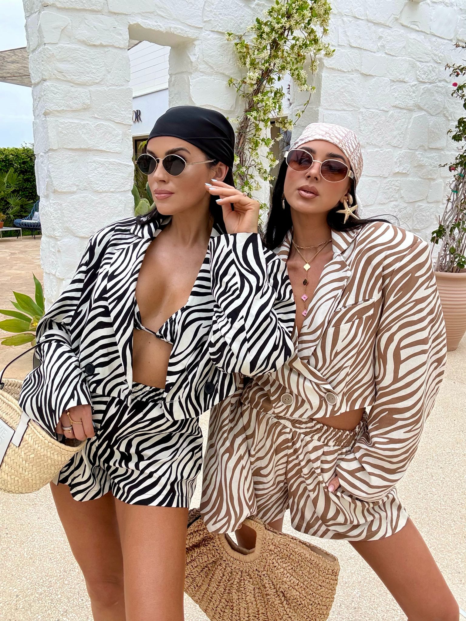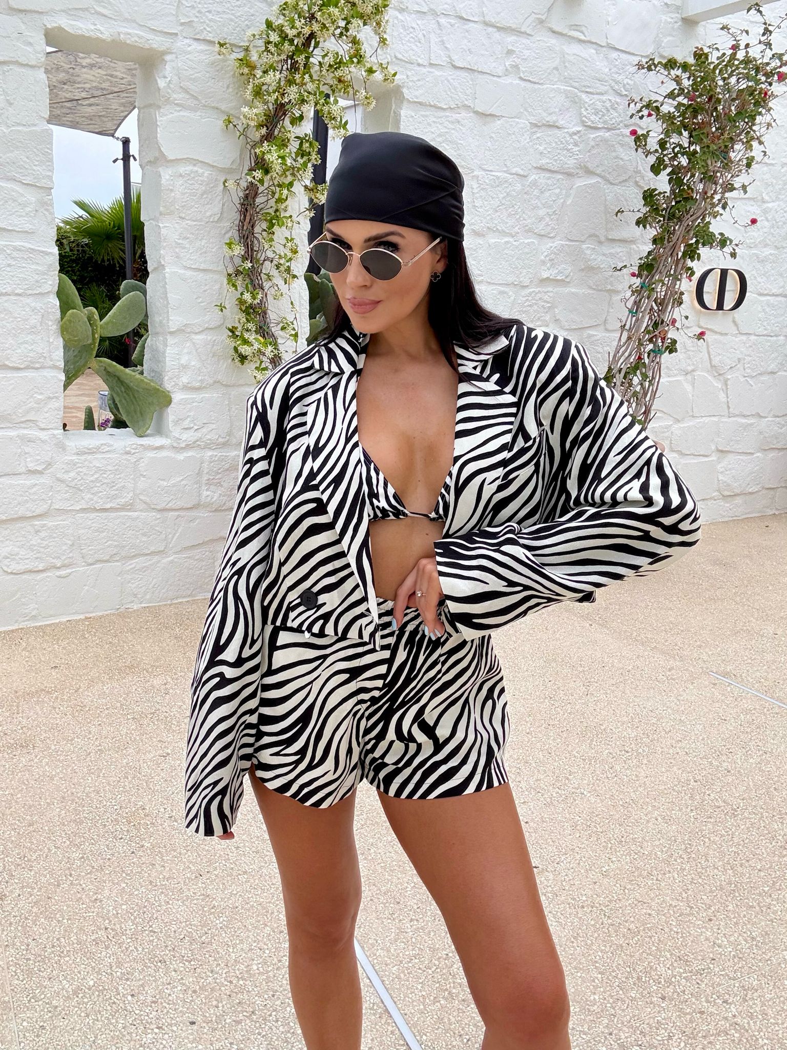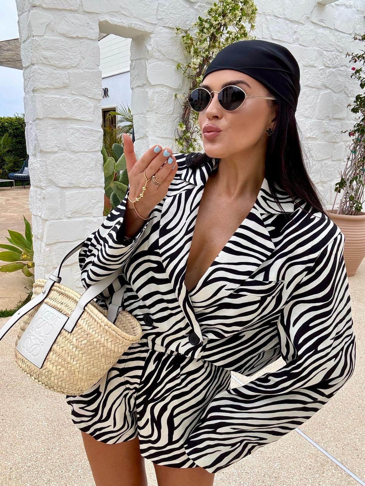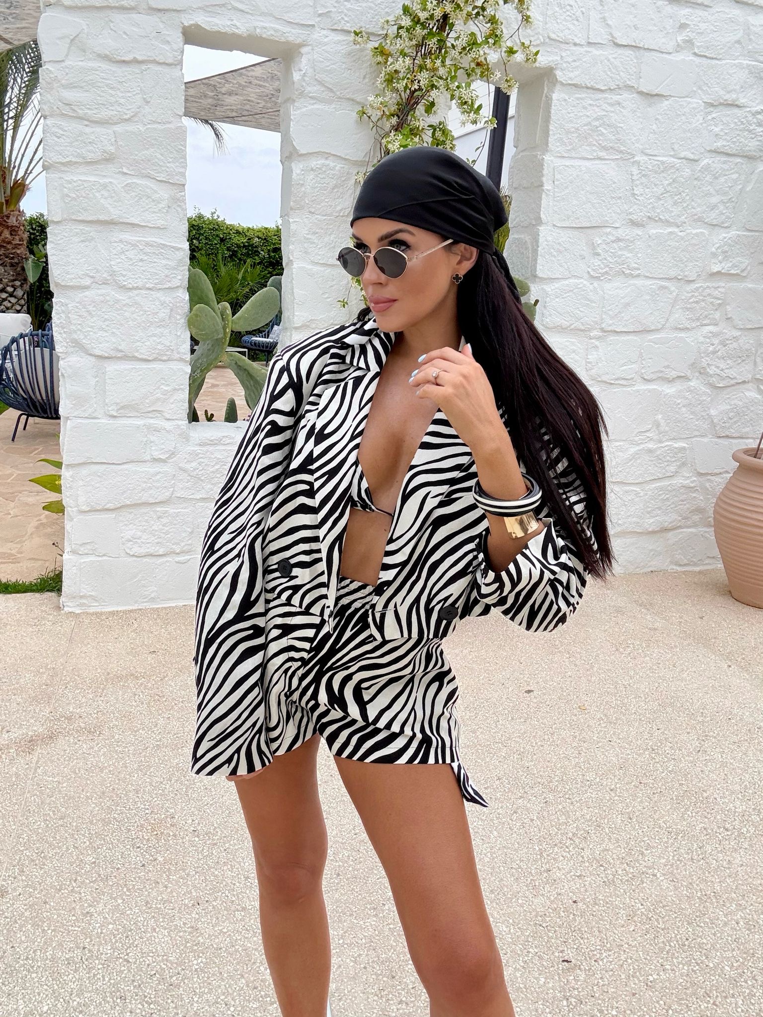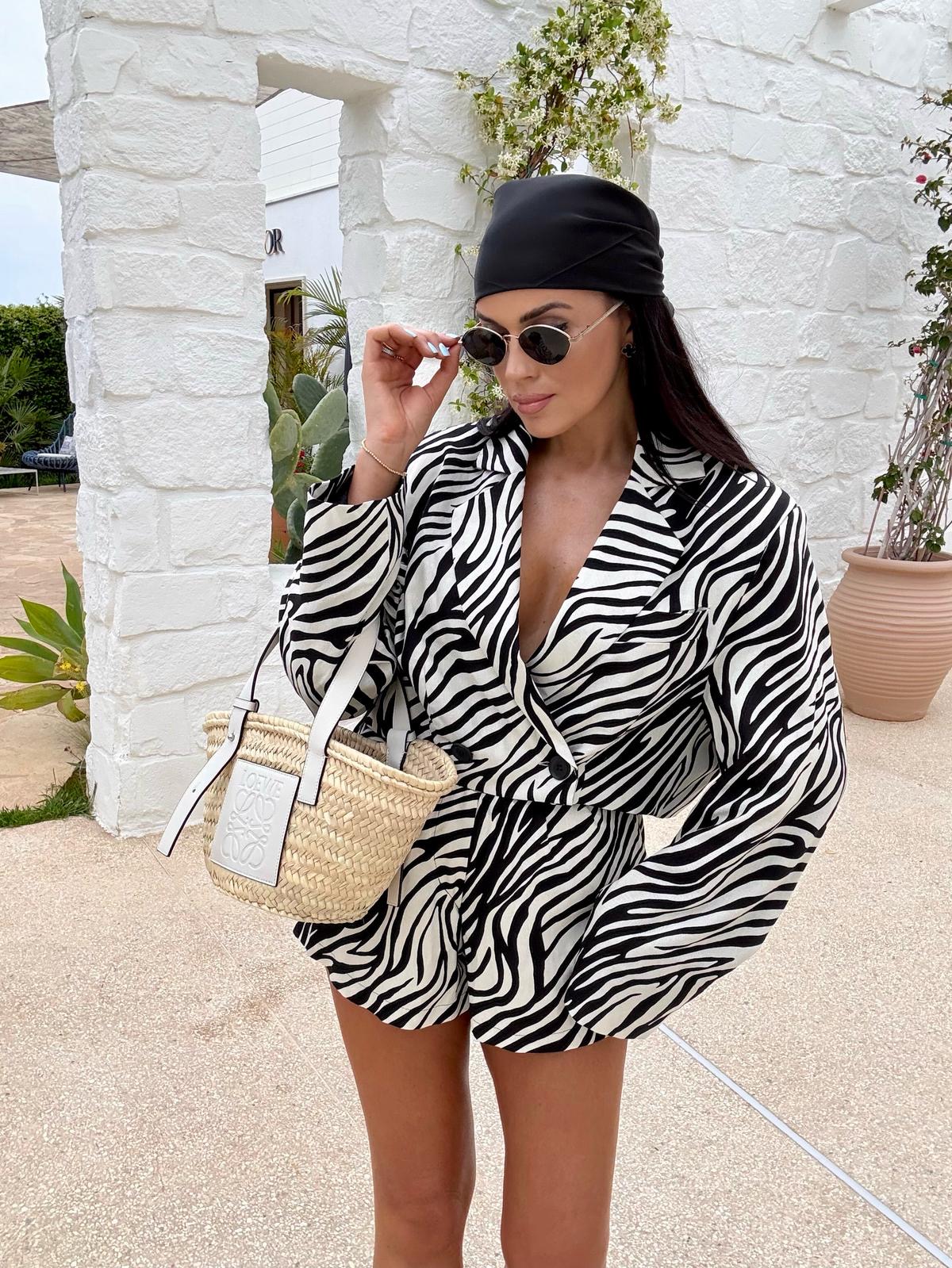 Stylowy komplet La Milla w modny wzór zebry to połączenie elegancji i luzu w nowoczesnym wydaniu. Oversize’owa marynarka z podkreślonymi ramionami idealnie współgra z krótkimi, luźnymi szortami. Kolorystyka czarny-ecru sprawia, że zestaw wyróżnia się, a jednocześnie pozostaje uniwersalny – doskonały zarówno na co dzień, jak i na wieczorne wyjścia. Noś razem lub osobno i twórz stylizacje pełne charakteru!