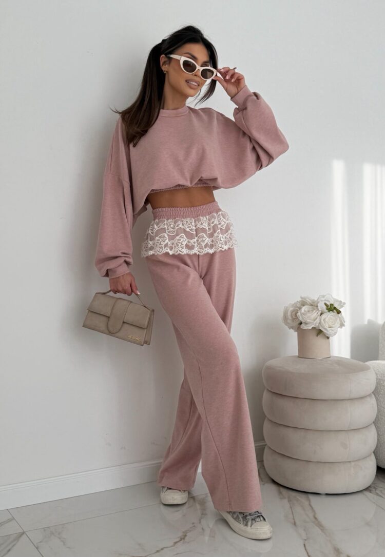 Kobiecy komplet z miękkiej dzianiny w pudrowo-różowym odcieniu, z efektowną koronką w pasie. Krótka bluza z długim rękawem posiada ściągacz na dole, dzięki któremu można regulować jej długość i dopasować ją do sylwetki. Spodnie z szeroką nogawką tworzą stylowy, wygodny zestaw idealny na co dzień i na wyjątkowe stylizacje.