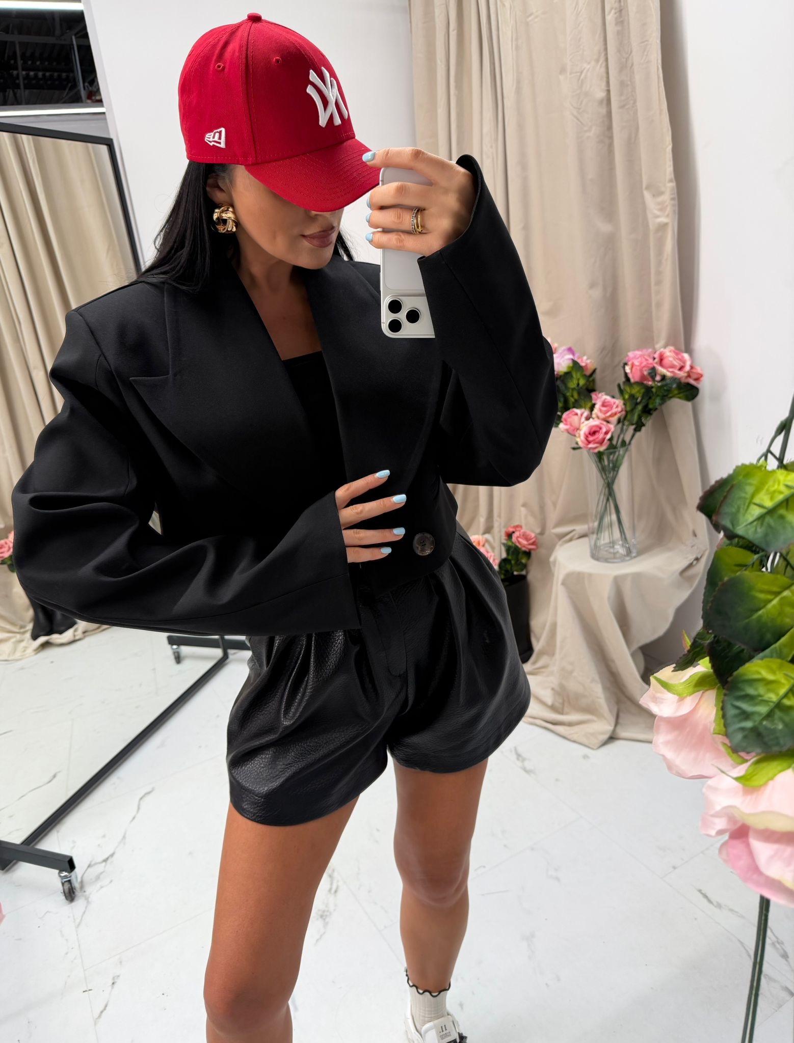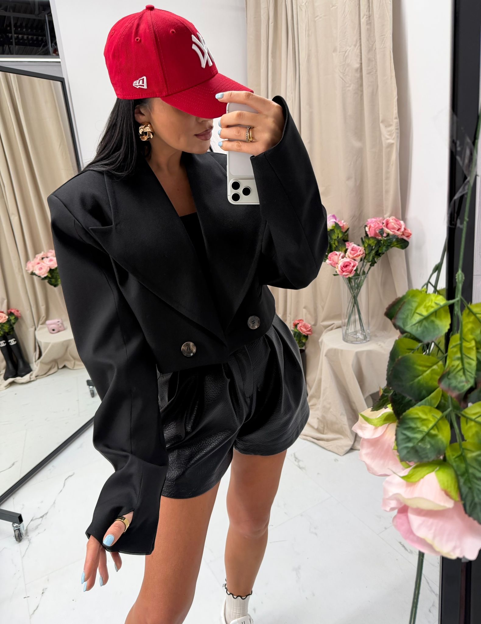 Krótka marynarka La Milla na palec czarna to nowoczesny model dla kobiet, które cenią modny, wyrazisty styl i dopracowane detale. Oversize’owy krój z podkreśloną linią ramion oraz ozdobne wycięcie na palec nadają całości unikalnego charakteru i przyciągają uwagę. Idealna do stylizacji miejskich, wieczorowych i fashion looków — świetnie komponuje się z topem, szortami, spódnicą lub spodniami z wysokim stanem.