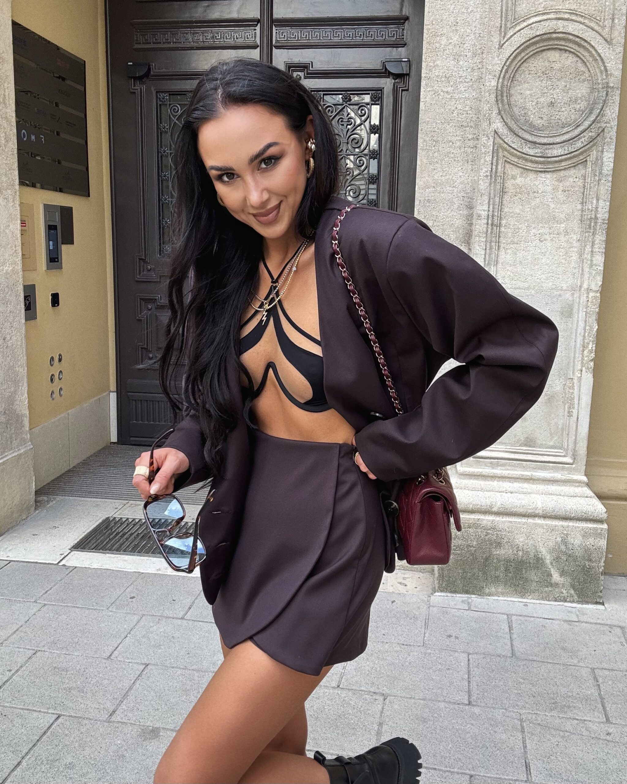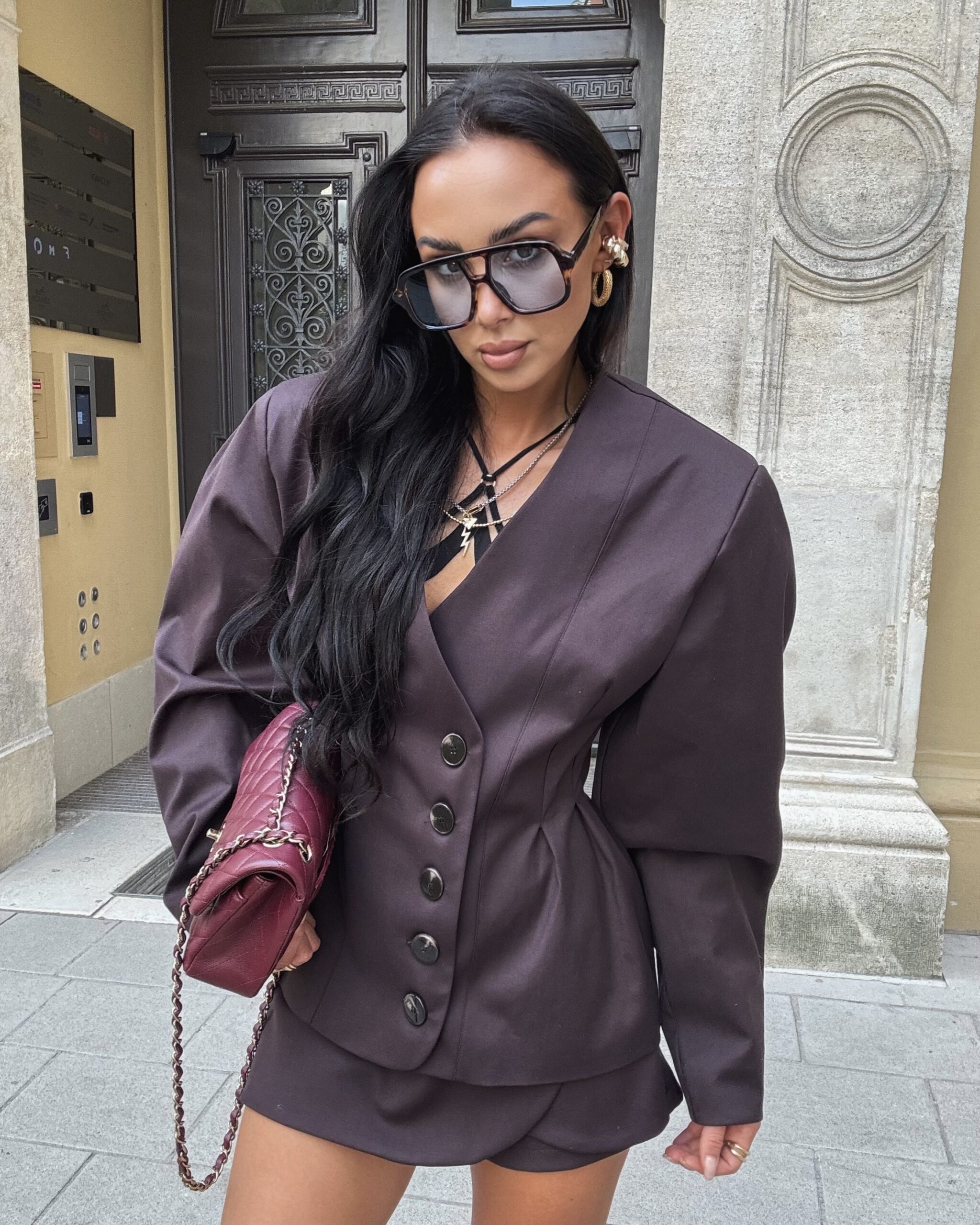 Marynarka La Milla w odcieniu czekoladowo-śliwkowym to elegancka propozycja dla kobiet ceniących styl i nowoczesny szyk. Taliowany fason pięknie podkreśla sylwetkę, a efektowne guziki dodają jej charakteru. Idealna do klasycznych i wieczorowych stylizacji.