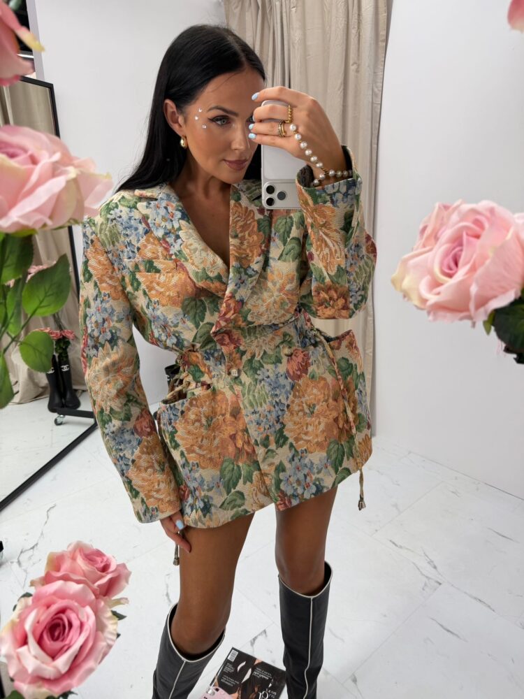Marynarka Rosalia La Milla to wyjątkowy model o kobiecym, eleganckim charakterze, który przyciąga uwagę unikalnym, żakardowym wzorem w kwiaty. Wykonana z wysokiej jakości materiału, doskonale podkreśla sylwetkę i nadaje stylizacjom luksusowego wyrazu.