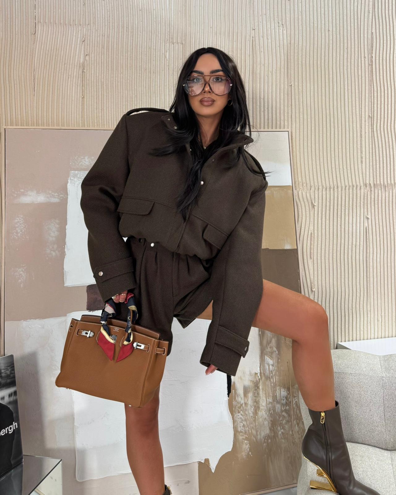Styl i elegancja w jesiennym wydaniu! Ocieplana bomberka La Milla w odcieniu głębokiego brązu to połączenie klasyki z nowoczesnym fasonem. Wykonana z miękkiej, ciepłej wełny, zapewnia komfort w chłodniejsze dni, a krótszy, lekko oversize’owy krój dodaje jej modowego charakteru.