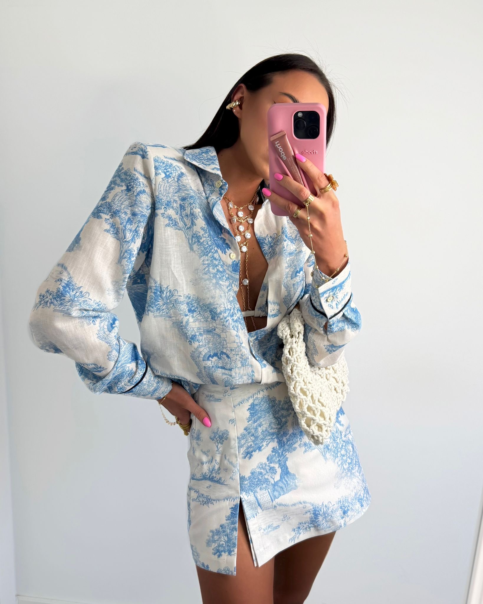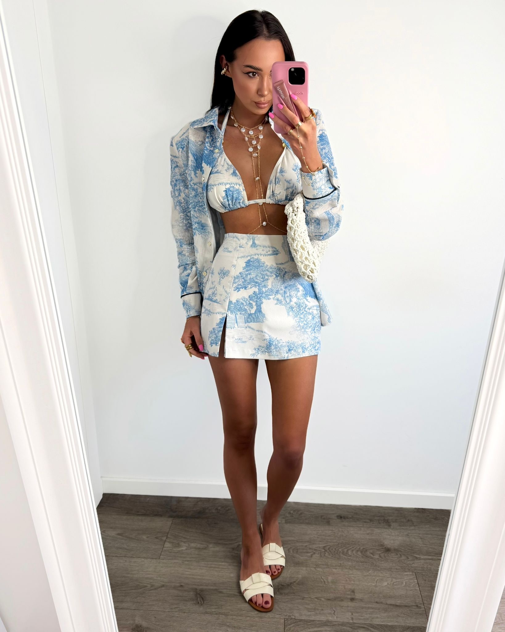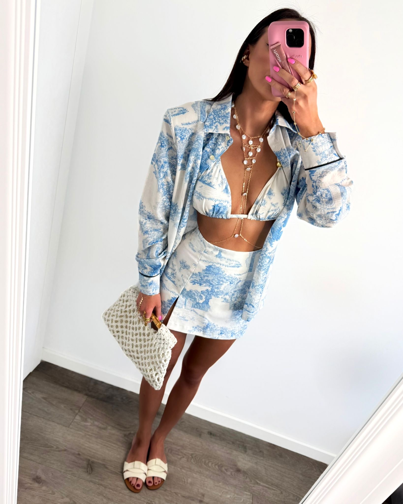 Spódnico-spodenki La Milla Nicea to połączenie kobiecego uroku z wygodą. Wykonane z lekkiego materiału, zachwycają niebieskim, klasycznym wzorem inspirowanym francuskim stylem. Z przodu wyglądają jak spódnica, z tyłu oferują komfort szortów – idealne na lato, spacery i stylowe wyjścia. Doskonale komponują się z marynarką z tej samej kolekcji.