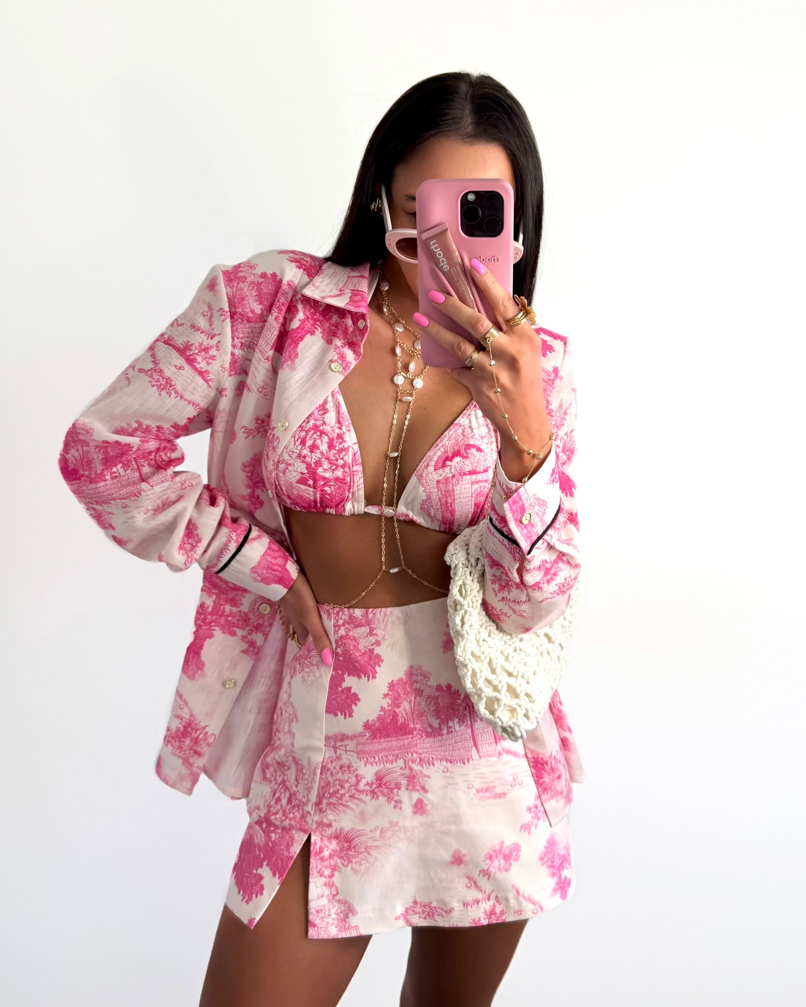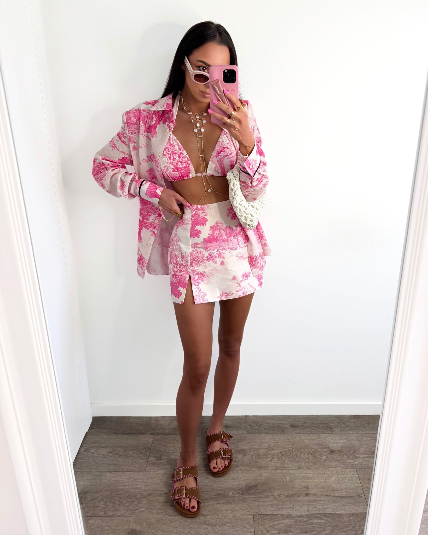 Spódnico-spodenki La Milla Nicea to połączenie kobiecego uroku z wygodą. Wykonane z lekkiego materiału, zachwycają różowym, klasycznym wzorem inspirowanym francuskim stylem. Z przodu wyglądają jak spódnica, z tyłu oferują komfort szortów – idealne na lato, spacery i stylowe wyjścia. Doskonale komponują się z marynarką z tej samej kolekcji.