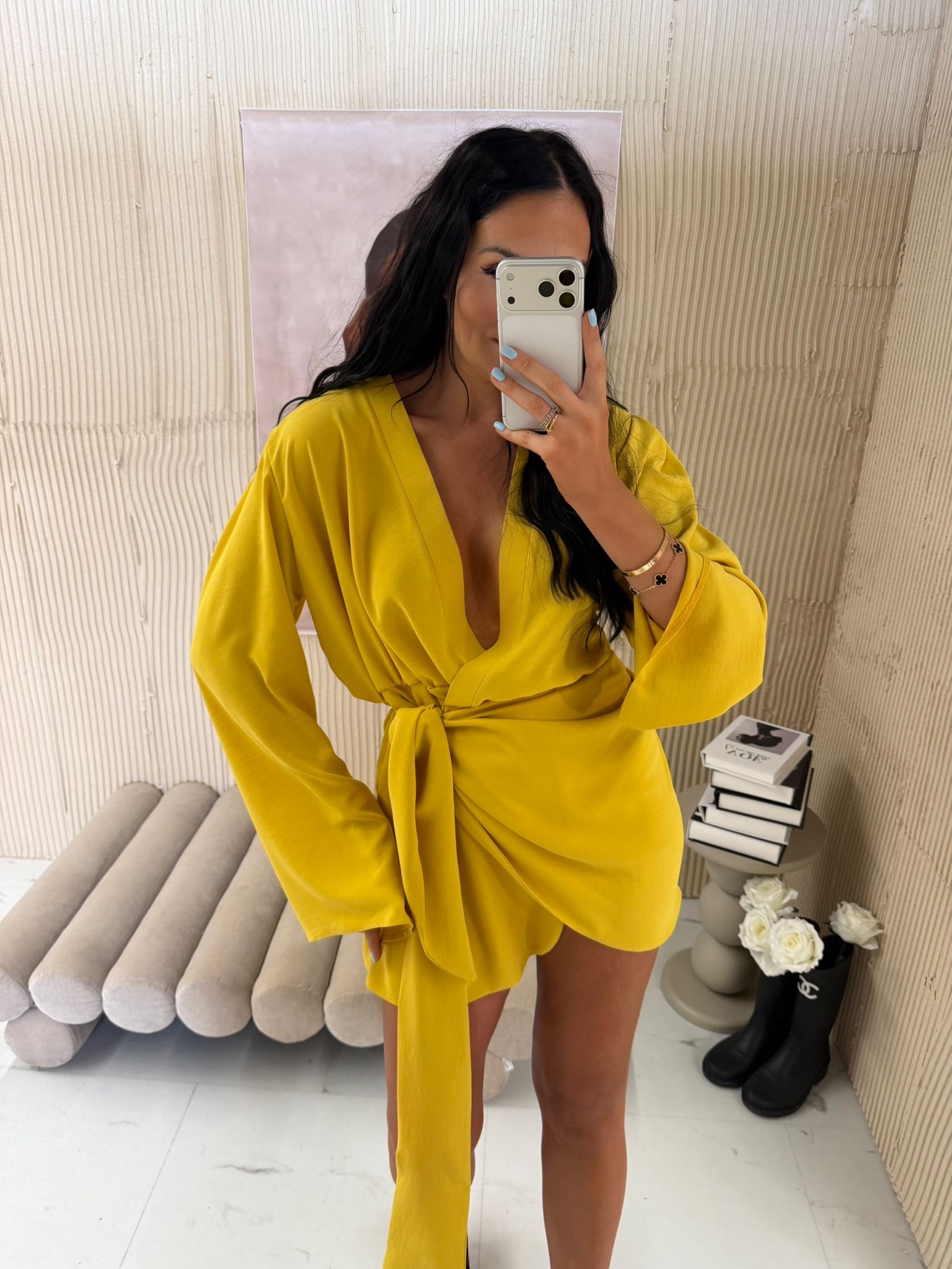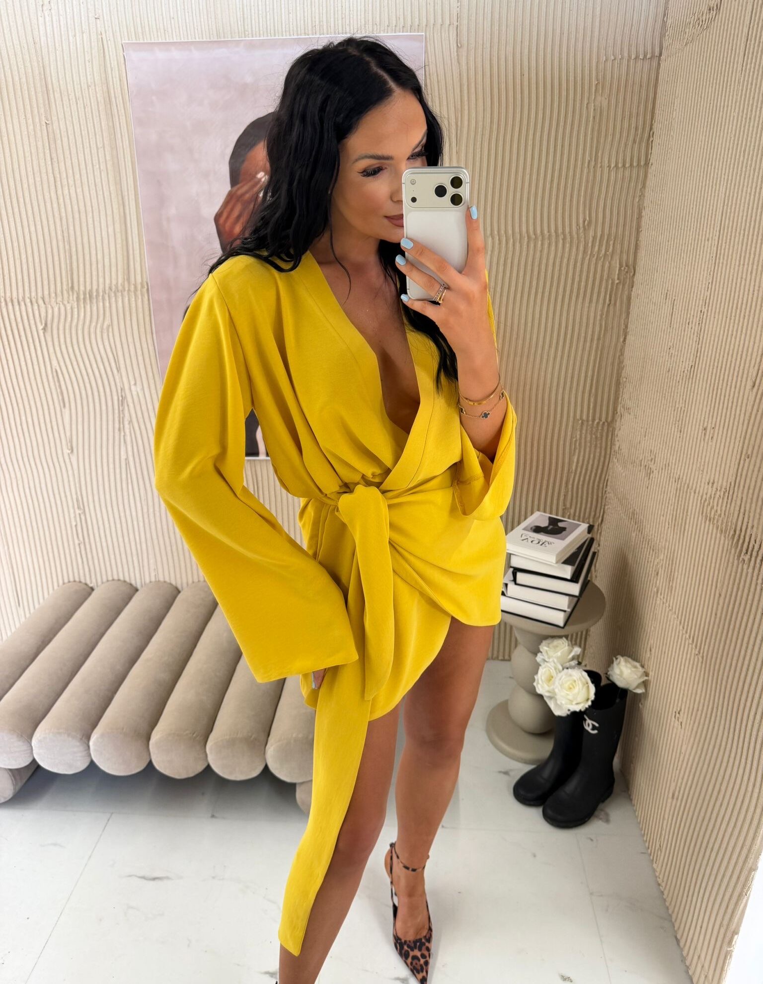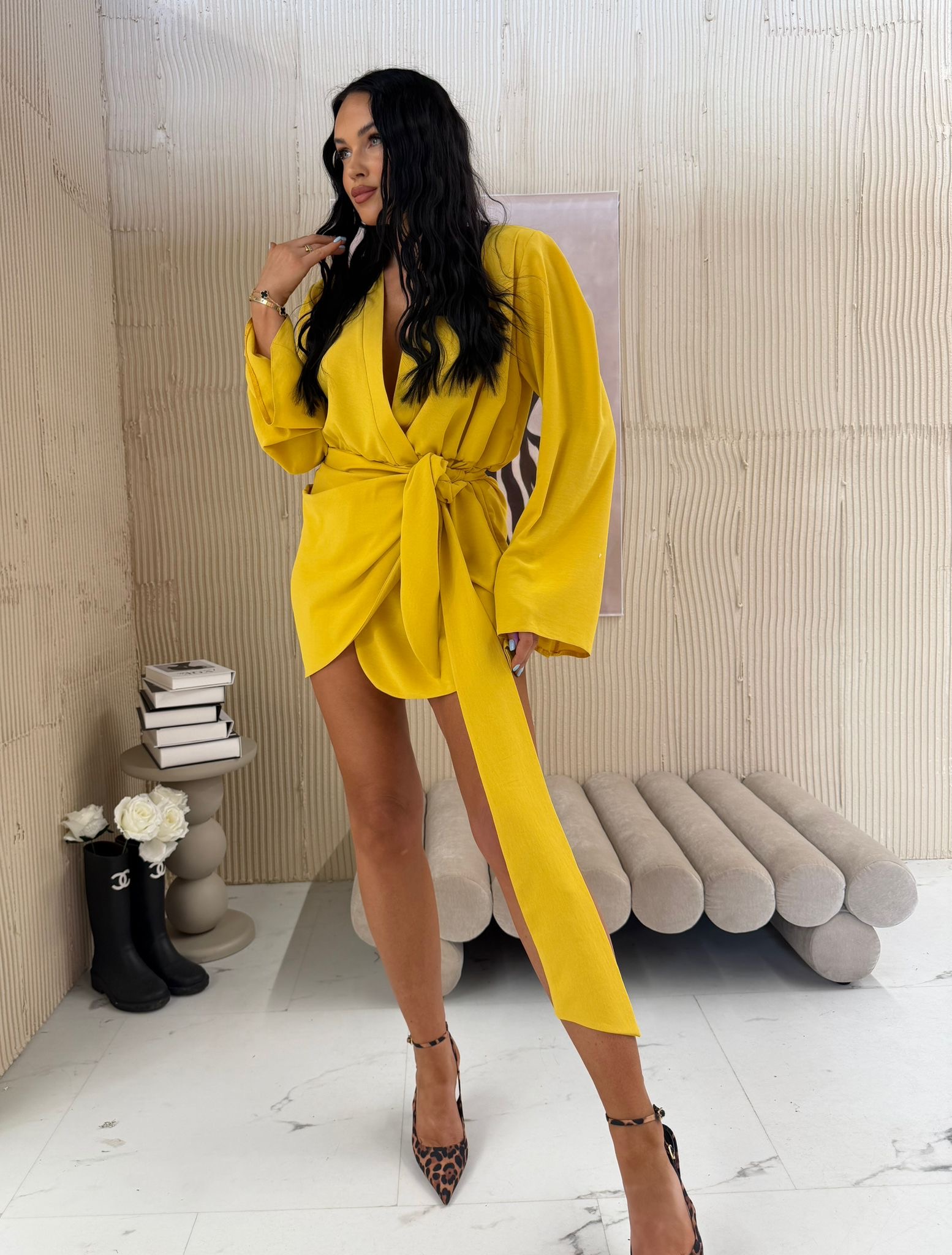 Wykonana z lejącego materiału pięknie układa się na sylwetce, a wiązanie w talii podkreśla kobiece kształty. Długie rękawy i asymetryczny krój nadają jej modowego charakteru, sprawiając, że świetnie sprawdzi się zarówno na wieczorne wyjścia, jak i stylowe spotkania w ciągu dnia.