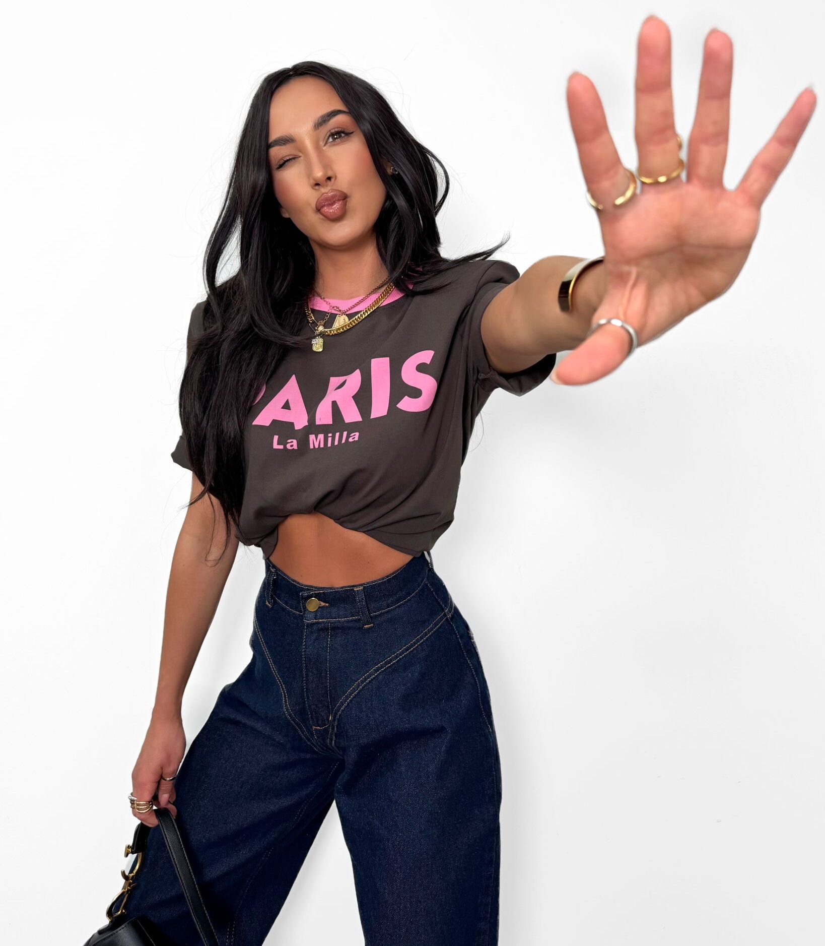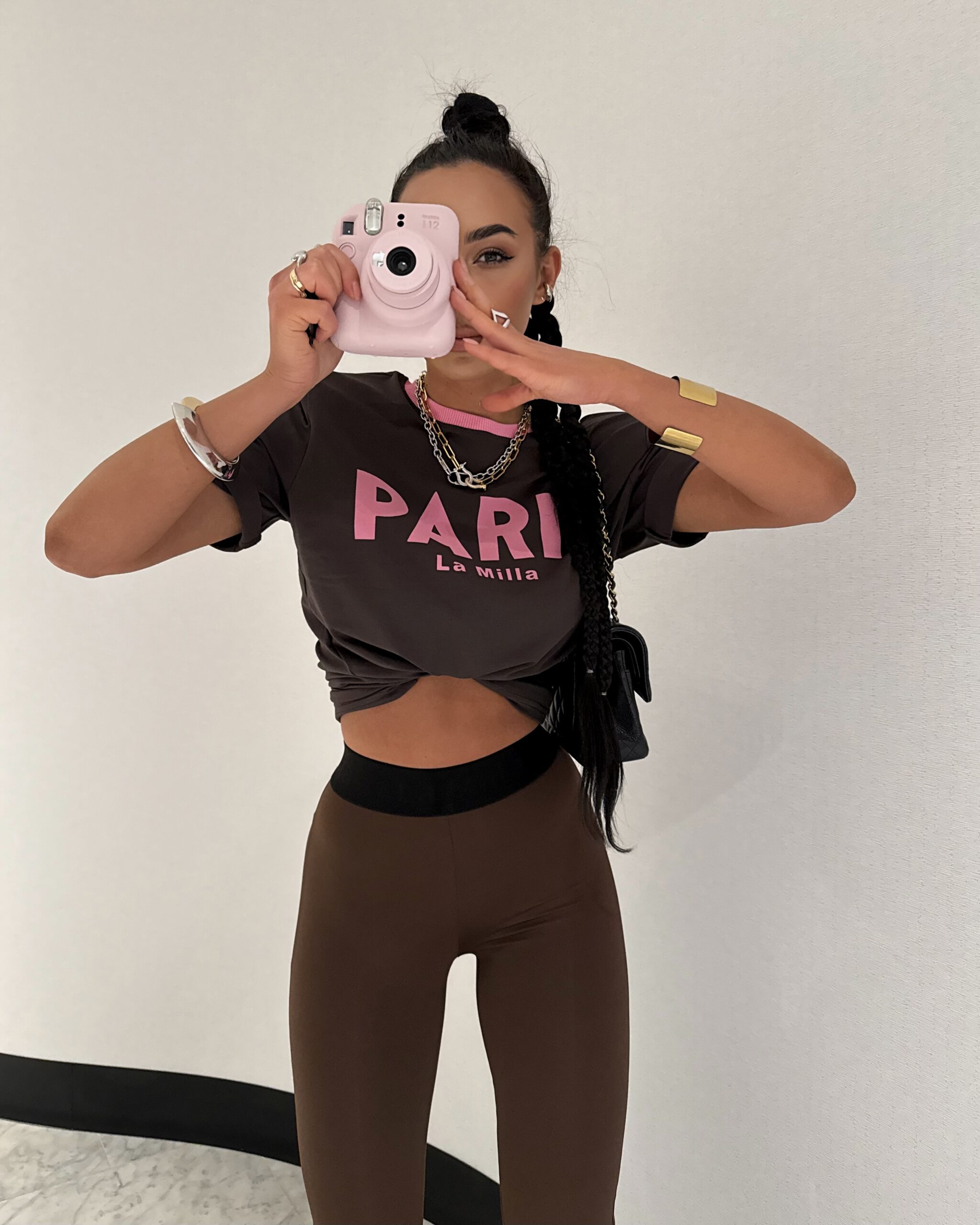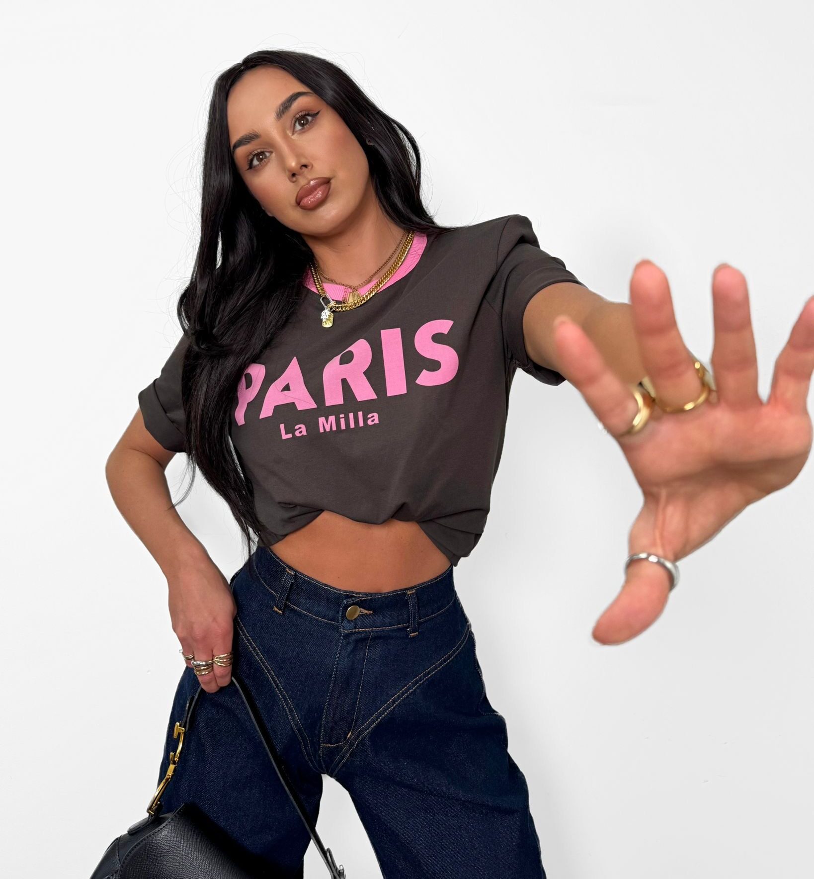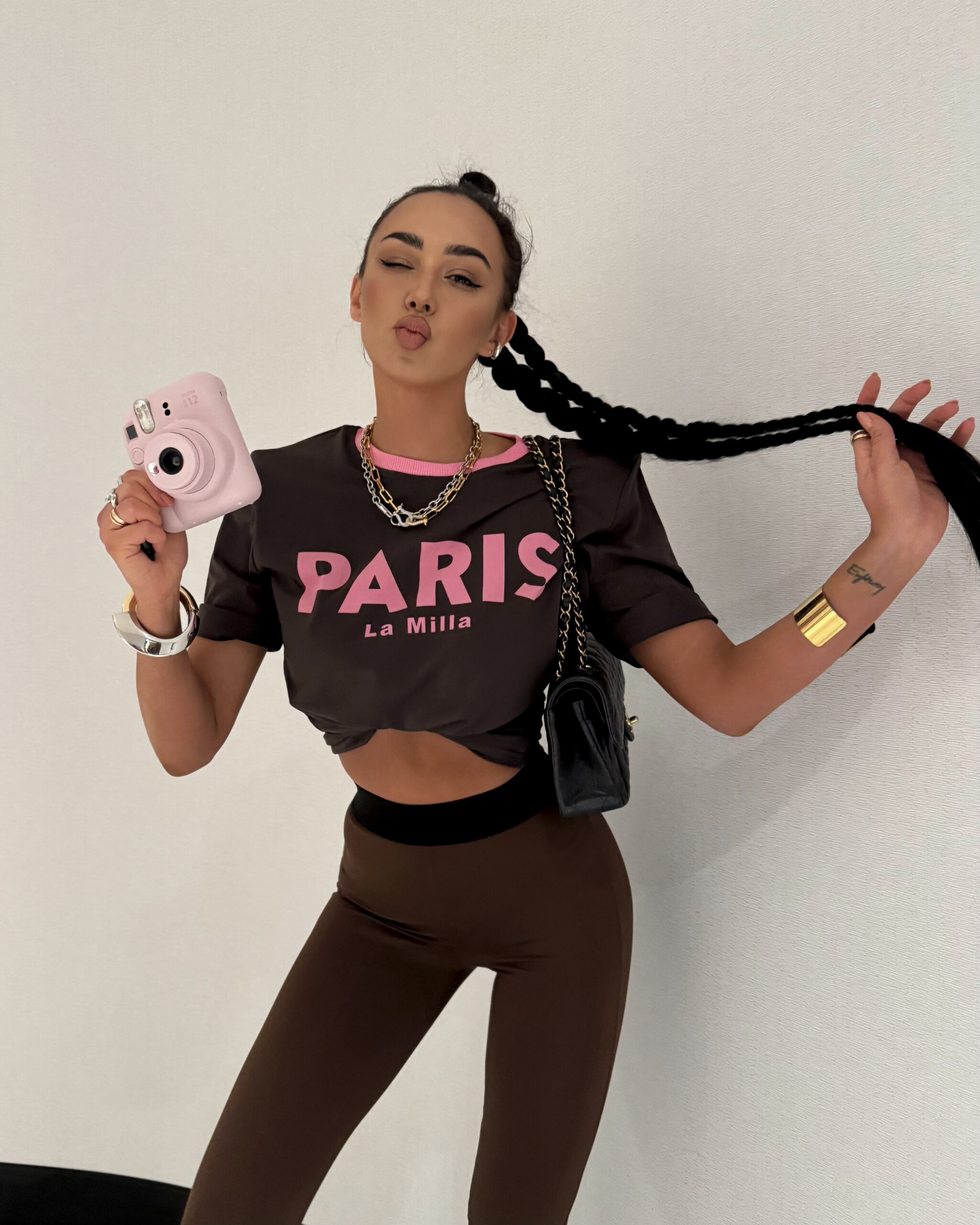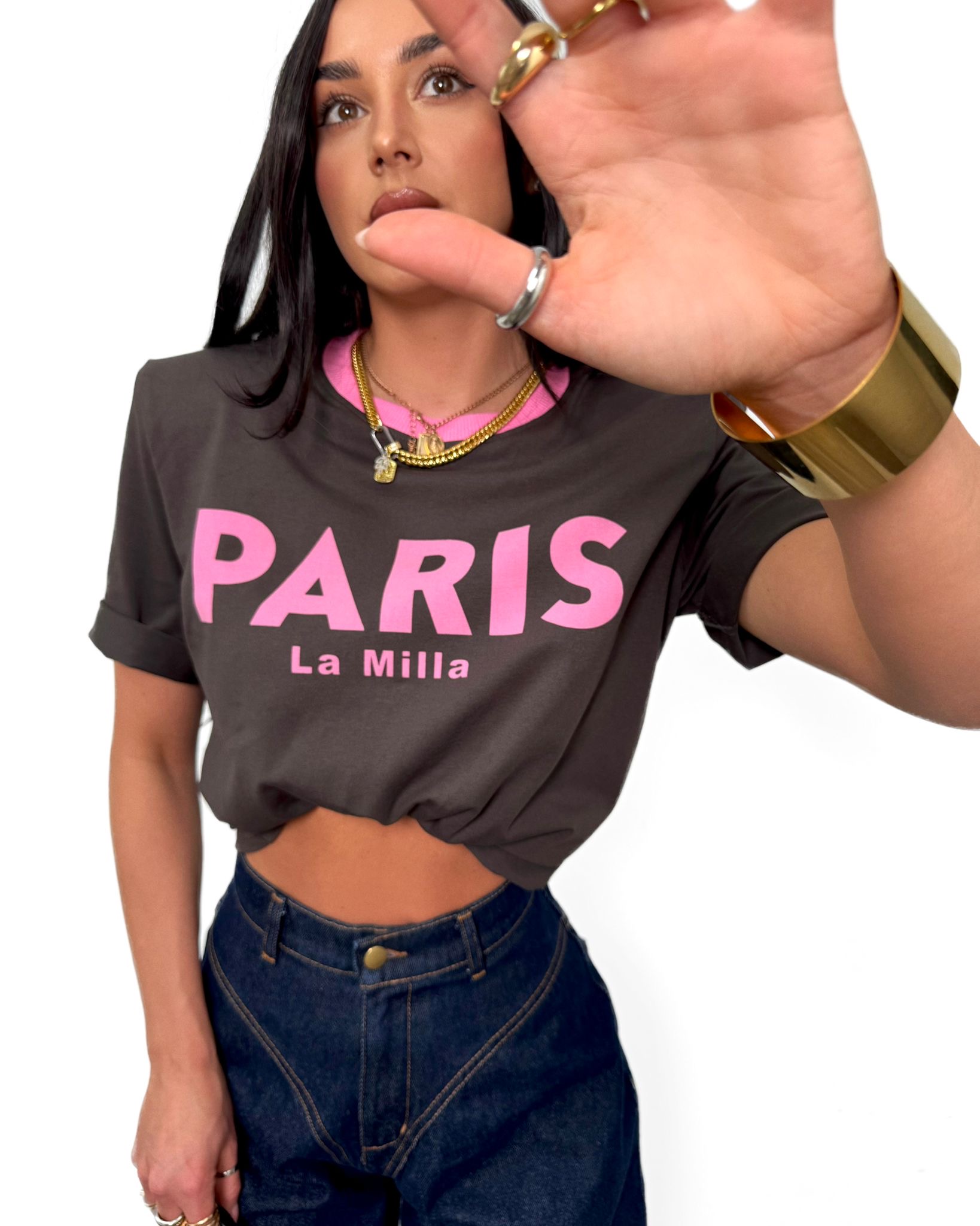 Modny t-shirt w kolorze czekoladowym z różowym nadrukiem PARIS La Milla. Wykonany z wysokiej jakości, miękkiej bawełny, zapewnia komfort i styl na co dzień. Klasyczny krój z okrągłym dekoltem i kontrastowym wykończeniem przy szyi dodaje mu wyjątkowego charakteru. Idealny do jeansów, szortów lub spódnicy – must have w każdej szafie!