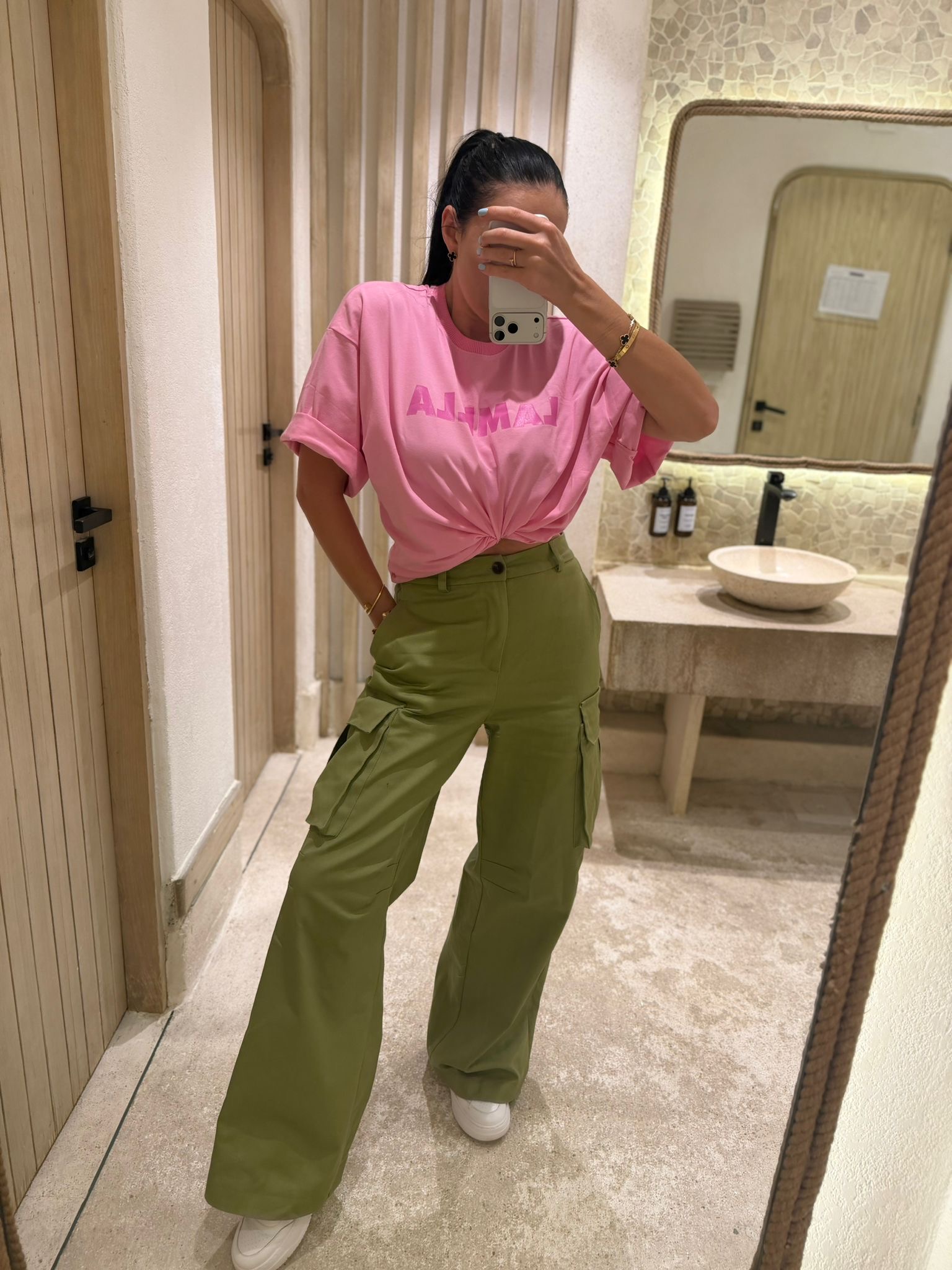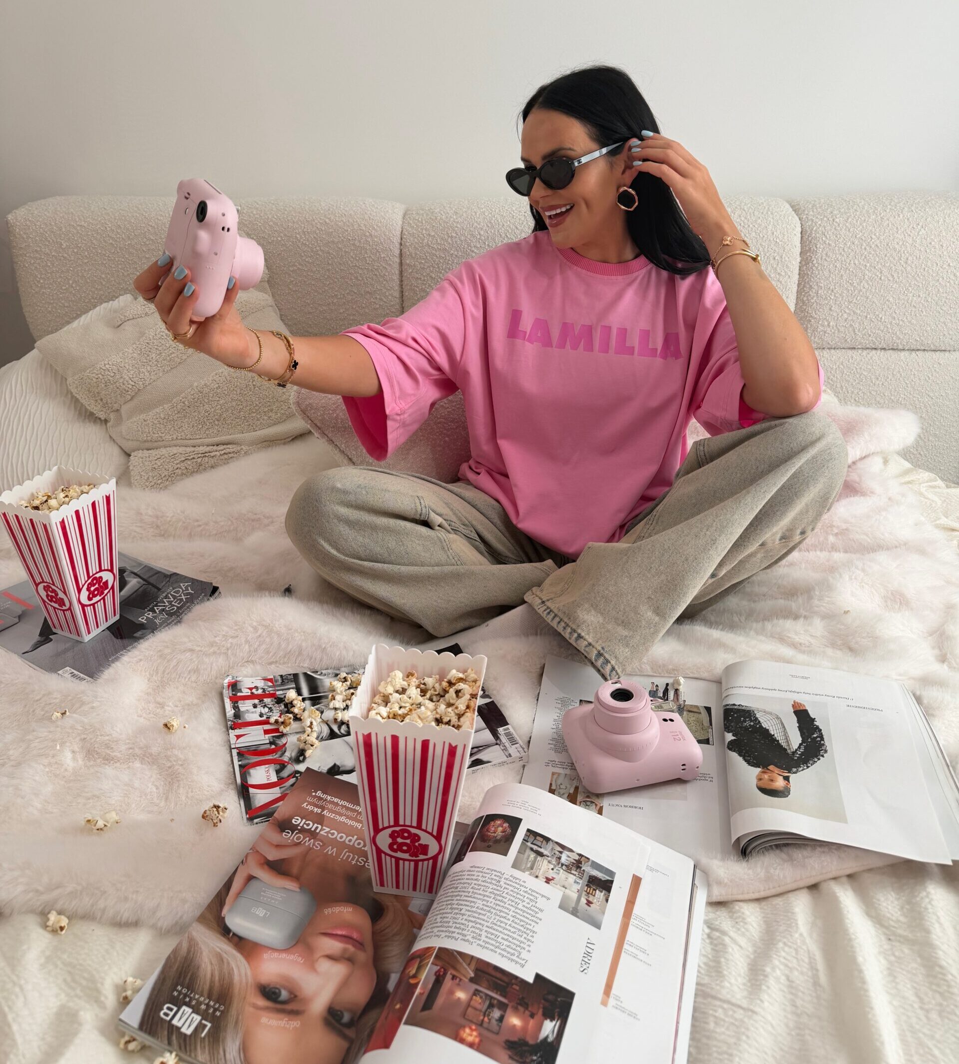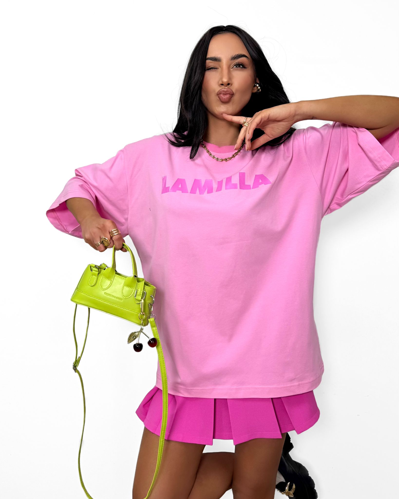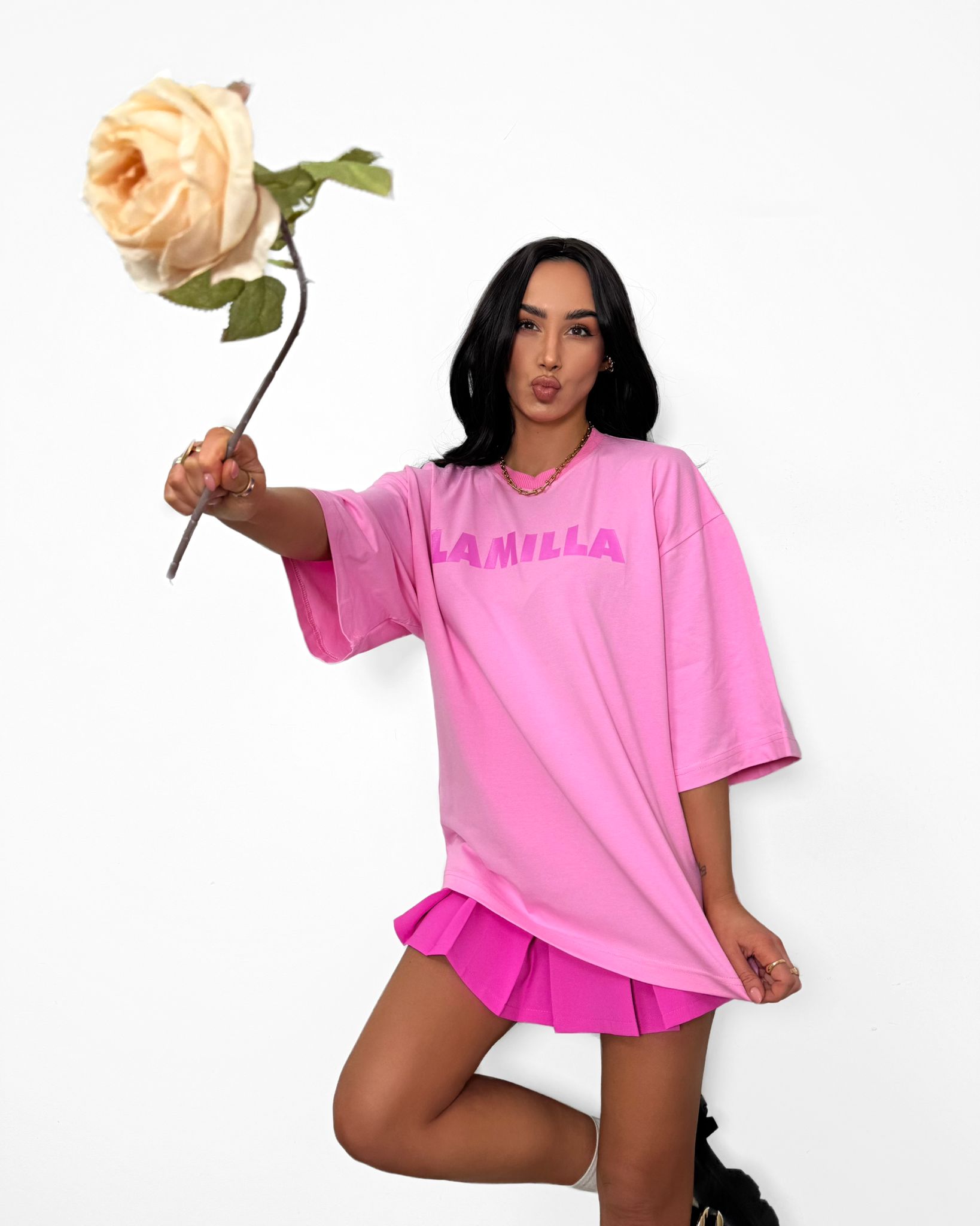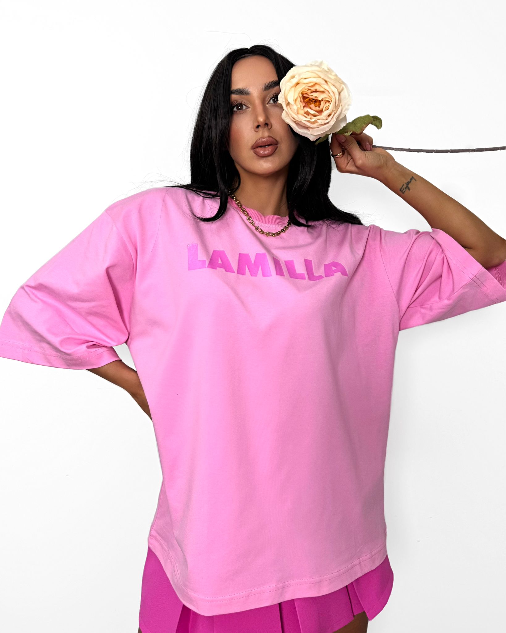 Uroczy t-shirt w odcieniu jasnego różu z kontrastowym nadrukiem La Milla. Wykonany z wysokiej jakości, miękkiej bawełny, gwarantuje komfort noszenia i modny wygląd. Klasyczny krój z okrągłym dekoltem sprawia, że świetnie pasuje do codziennych stylizacji – zarówno z jeansami, jak i spódnicą.